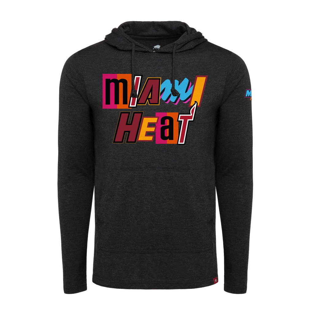 White Sportiqe men's tee with stylized black Miami HEAT logo text mashup design. - Sportiqe Miami HEAT Mashup Men's White Tee