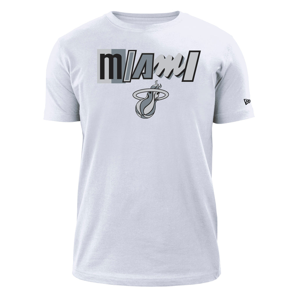 White Tyler Herro New Era Miami HEAT mashup t-shirt with stylized black and gray logo on front. - Tyler Herro New Era Miami HEAT Mashup Name & Number White Tee