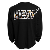 Black long-sleeve pullover with Miami HEAT graphic featuring fiery orange and red accents on bold white outlined text. - Court Culture Miami Mashup Vol. 2 Fuegito Black Pullover