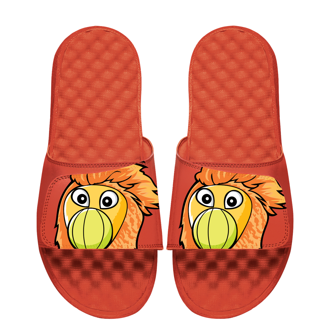 Orange Miami HEAT slides with cartoon lion face on textured footbed and straps. - Islide Miami HEAT Burnie Orange Sandals