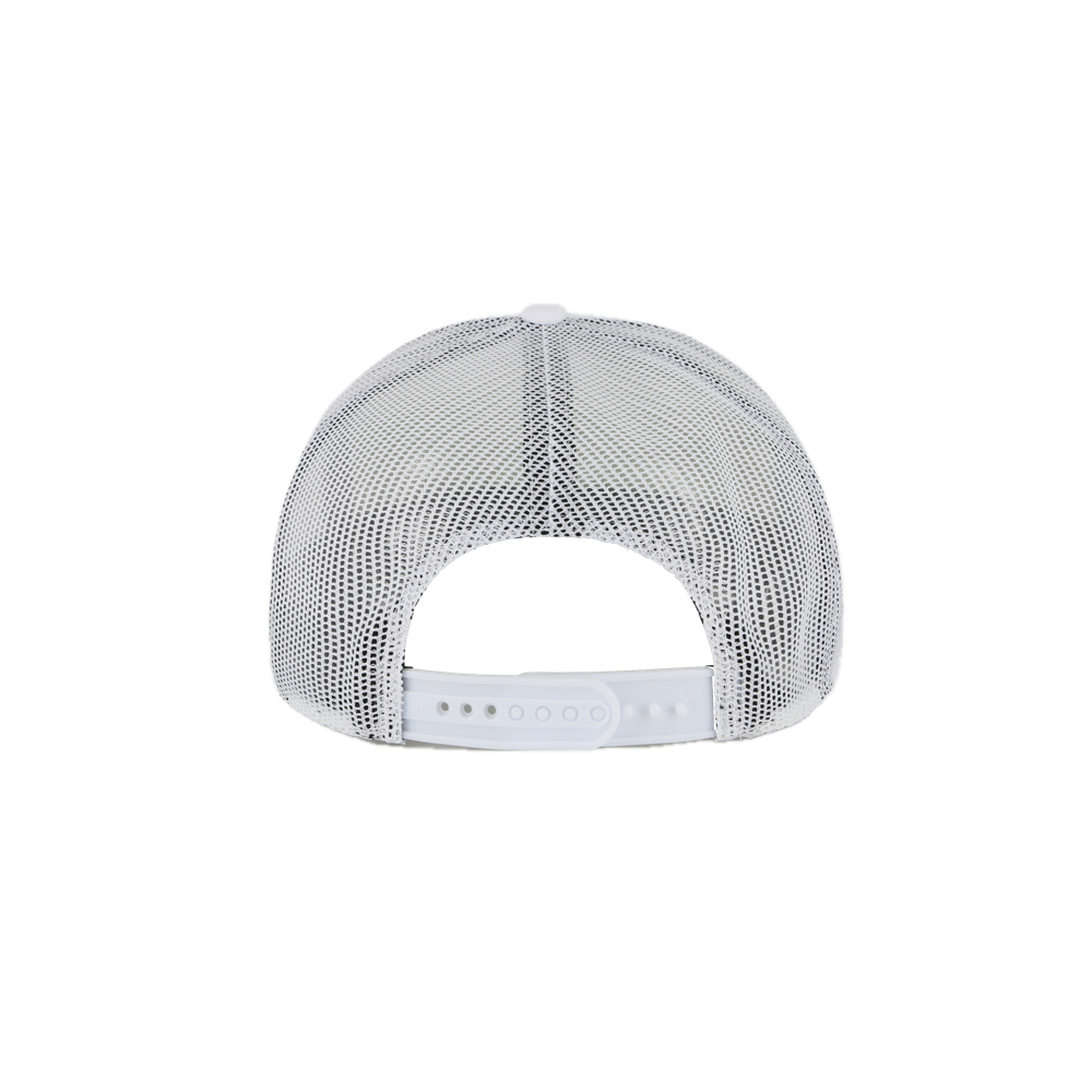 White mesh trucker snapback cap with adjustable plastic strap and purple stitching detail.