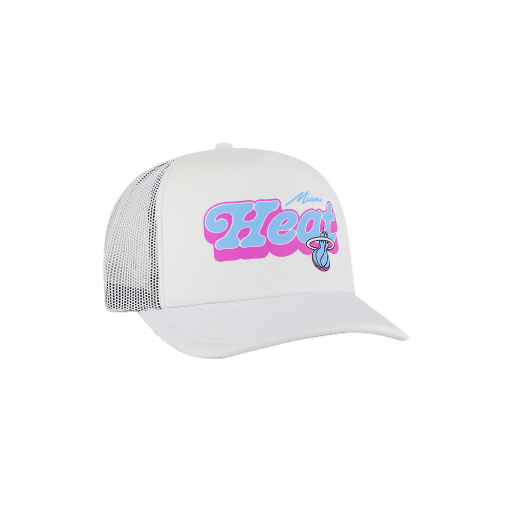 White trucker snapback hat with Miami Heat logo in pink and blue, mesh back and adjustable strap.