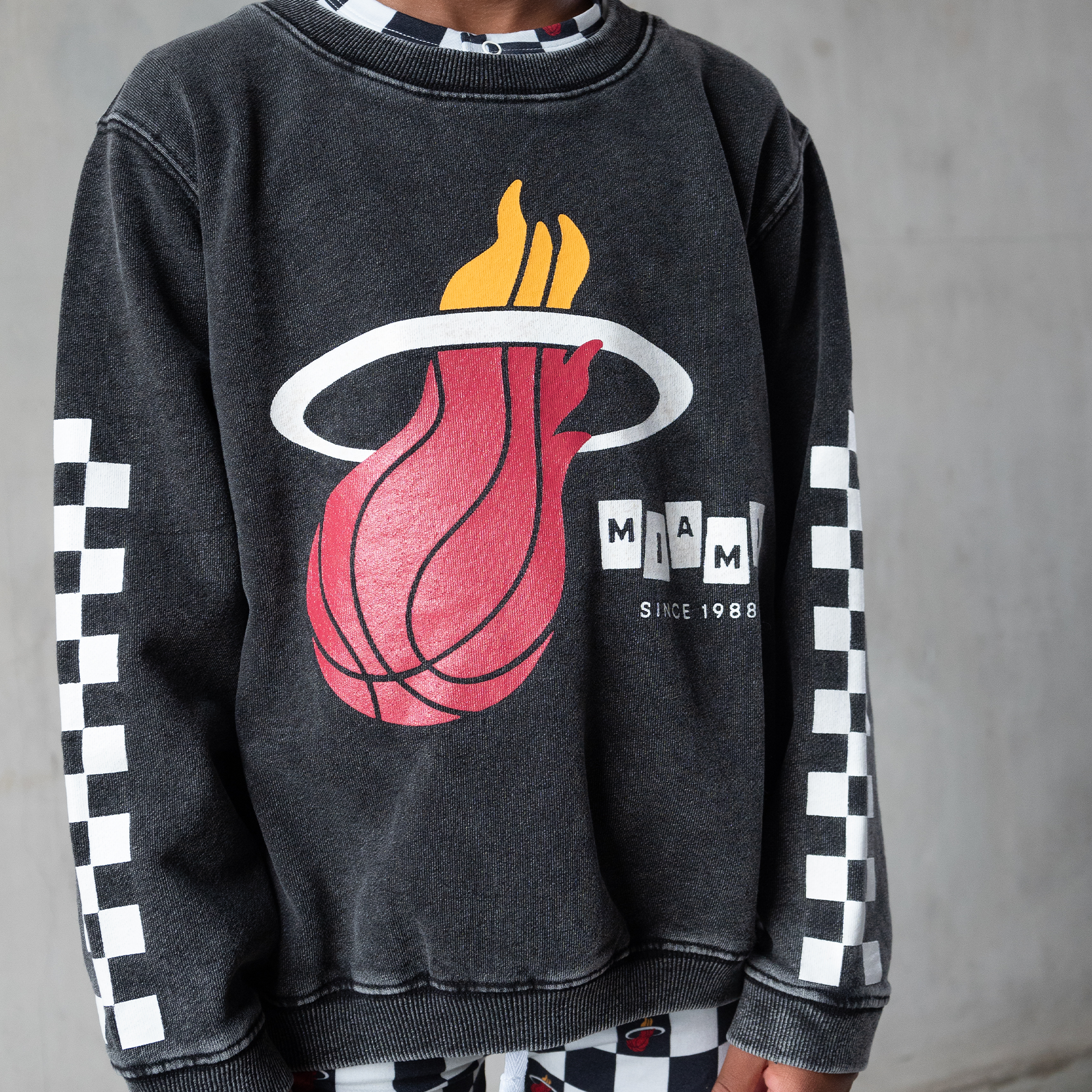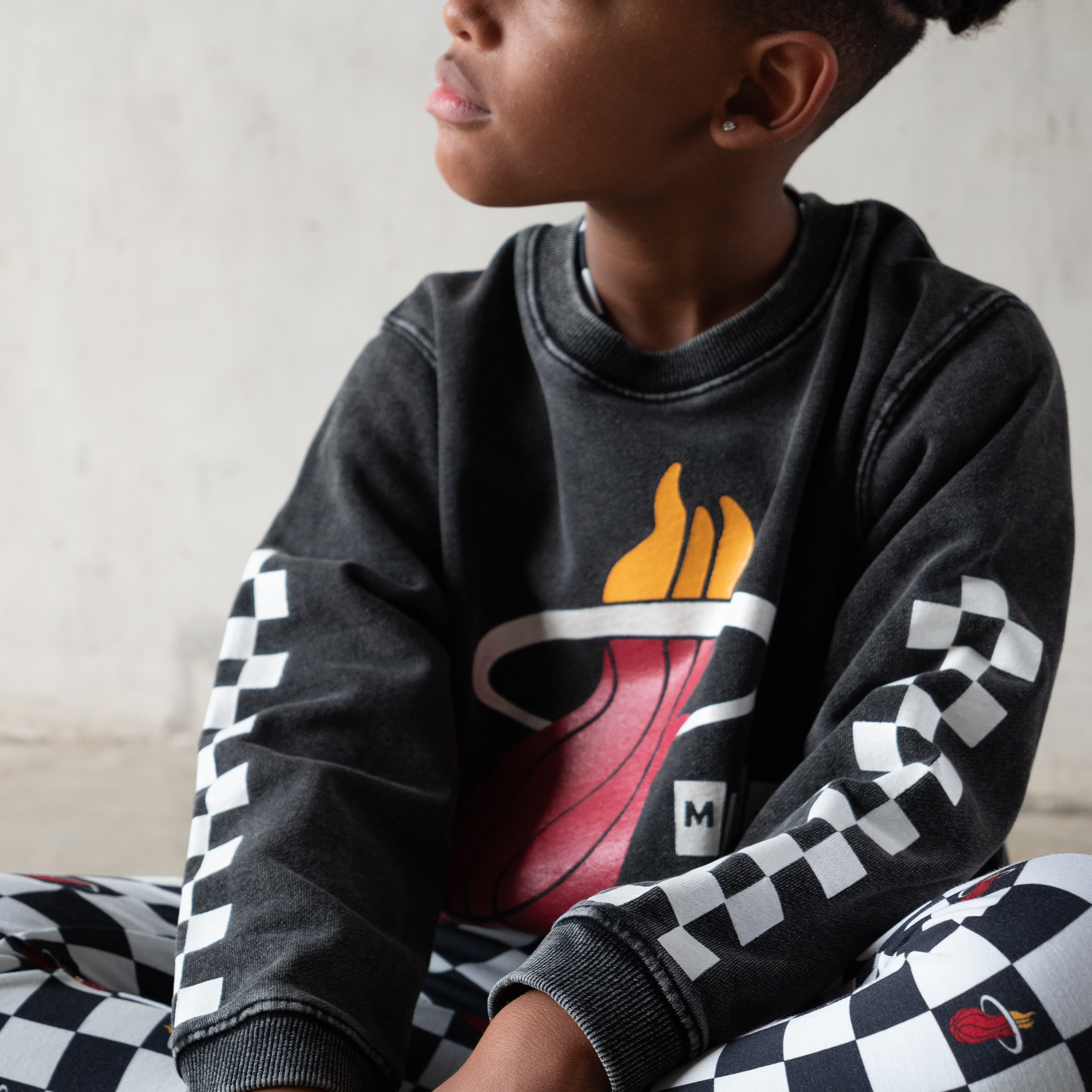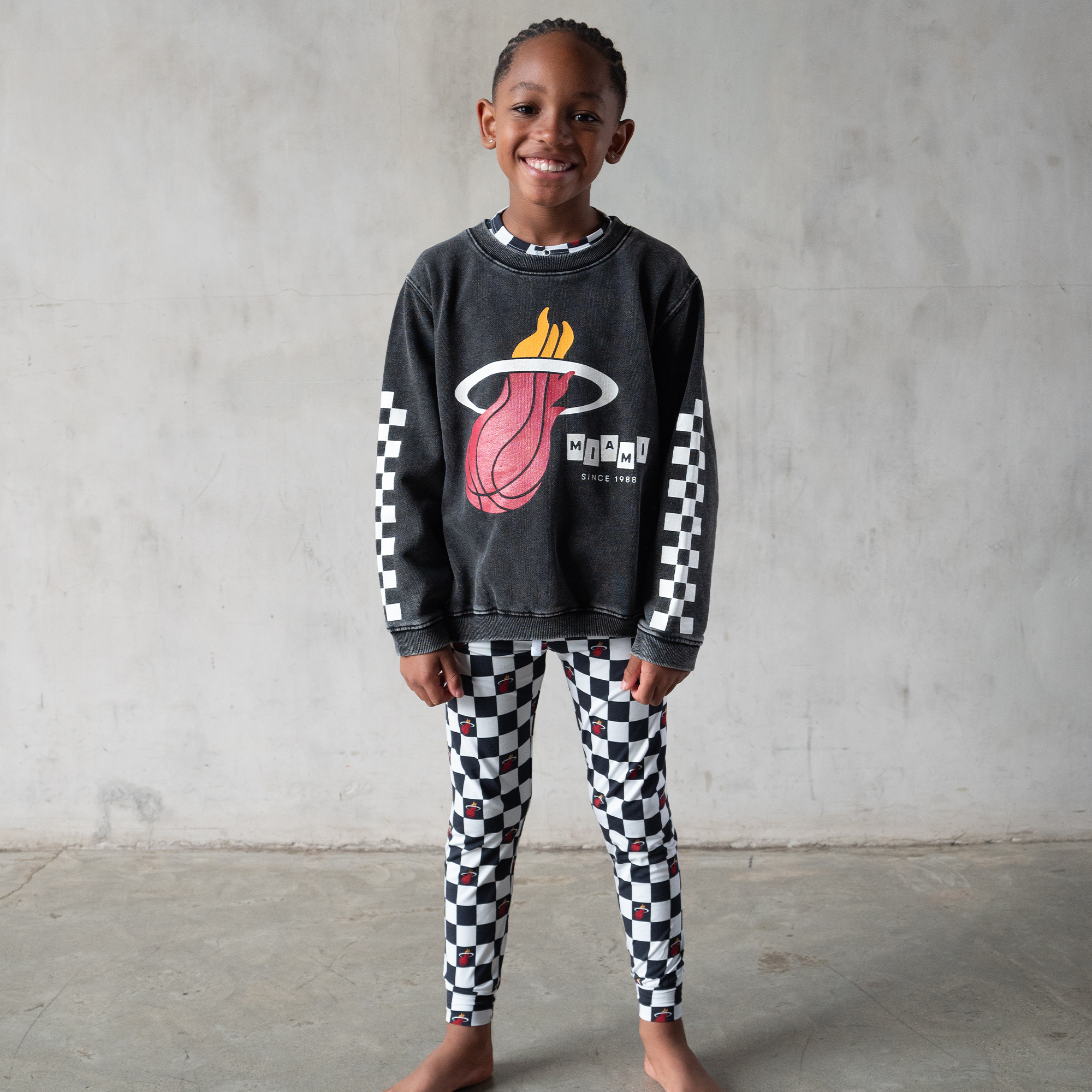 Black pullover with Miami Heat flaming basketball logo and white checkerboard sleeves on a child model.