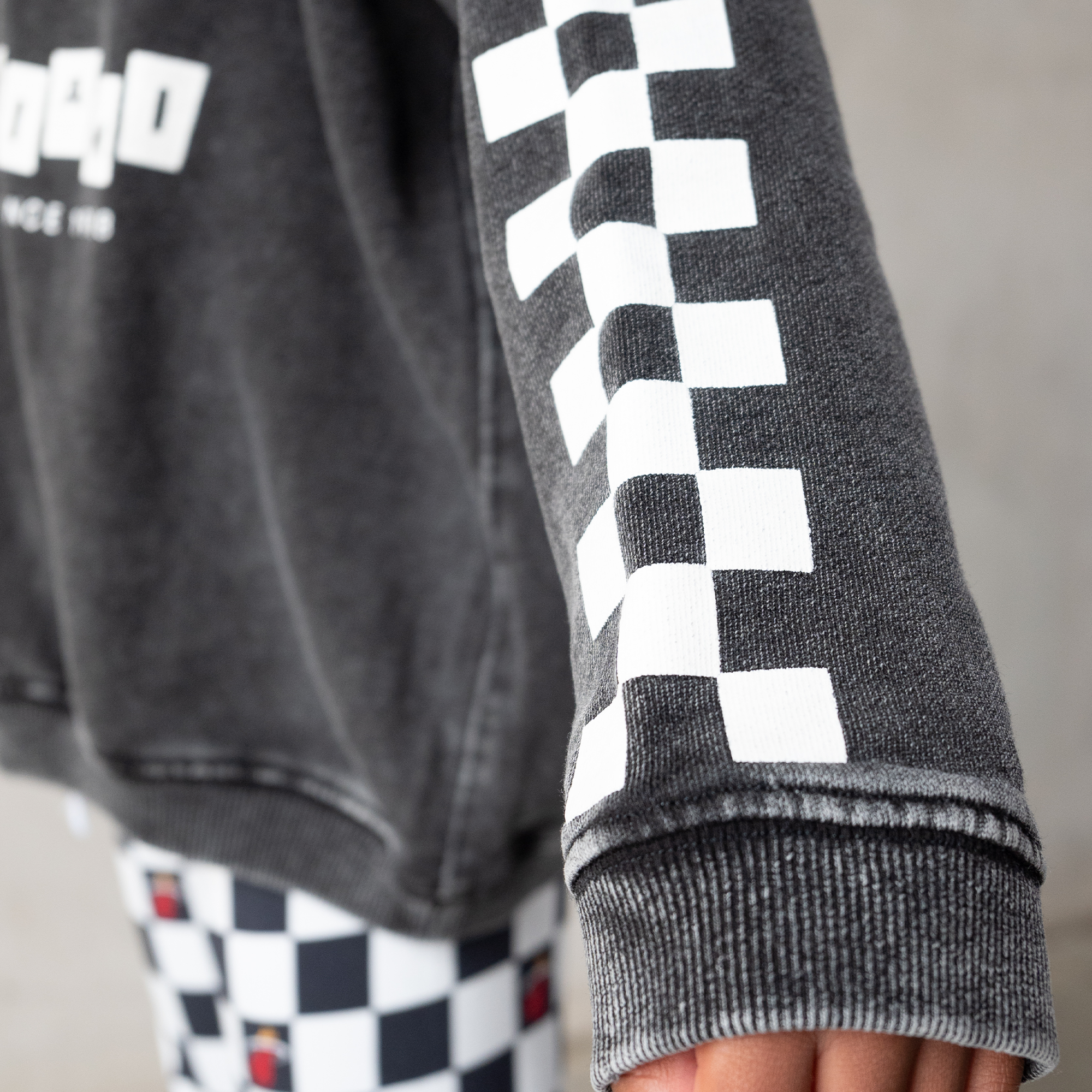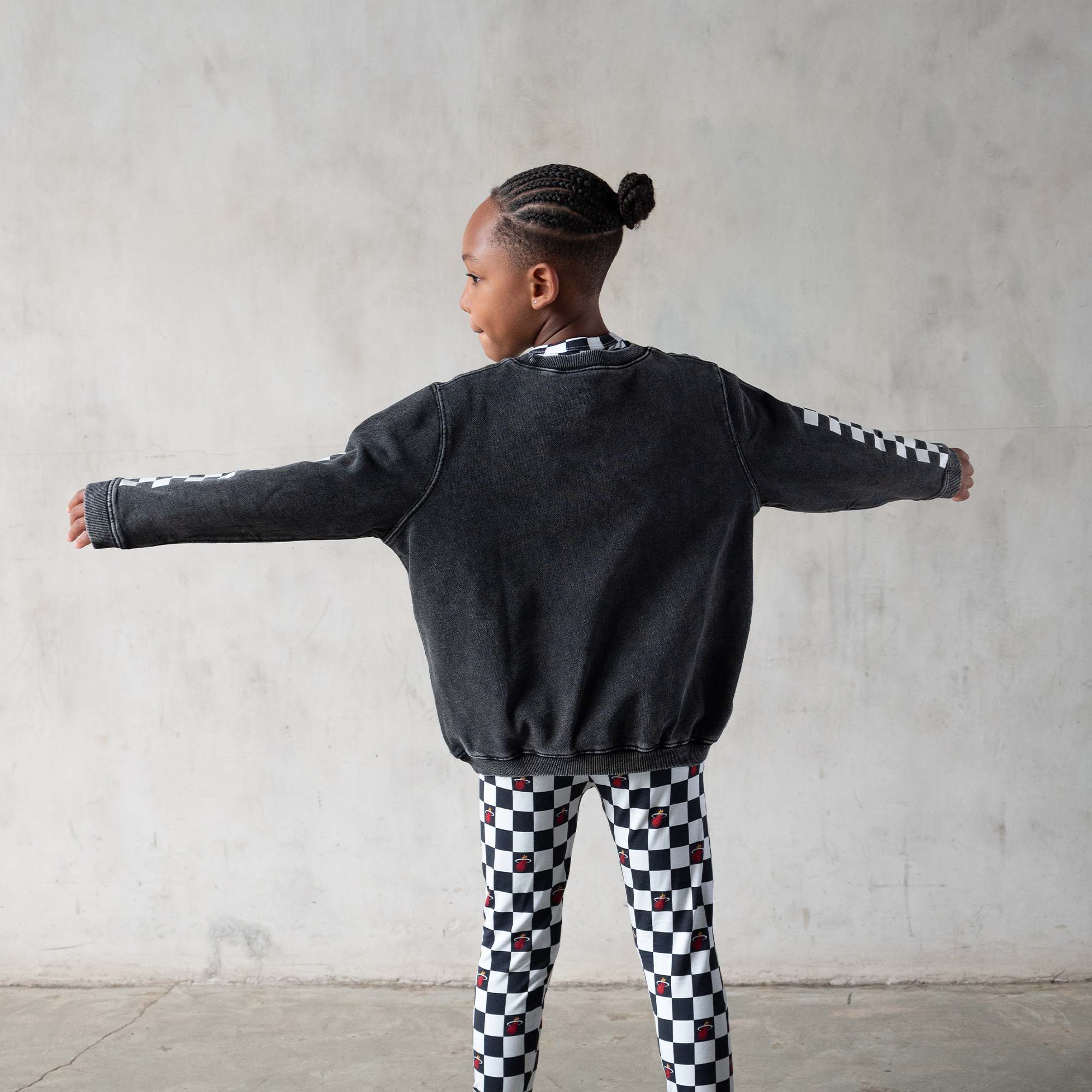 Black pullover with white checkerboard stripes down sleeves, paired with black and white checkerboard pants on child model.