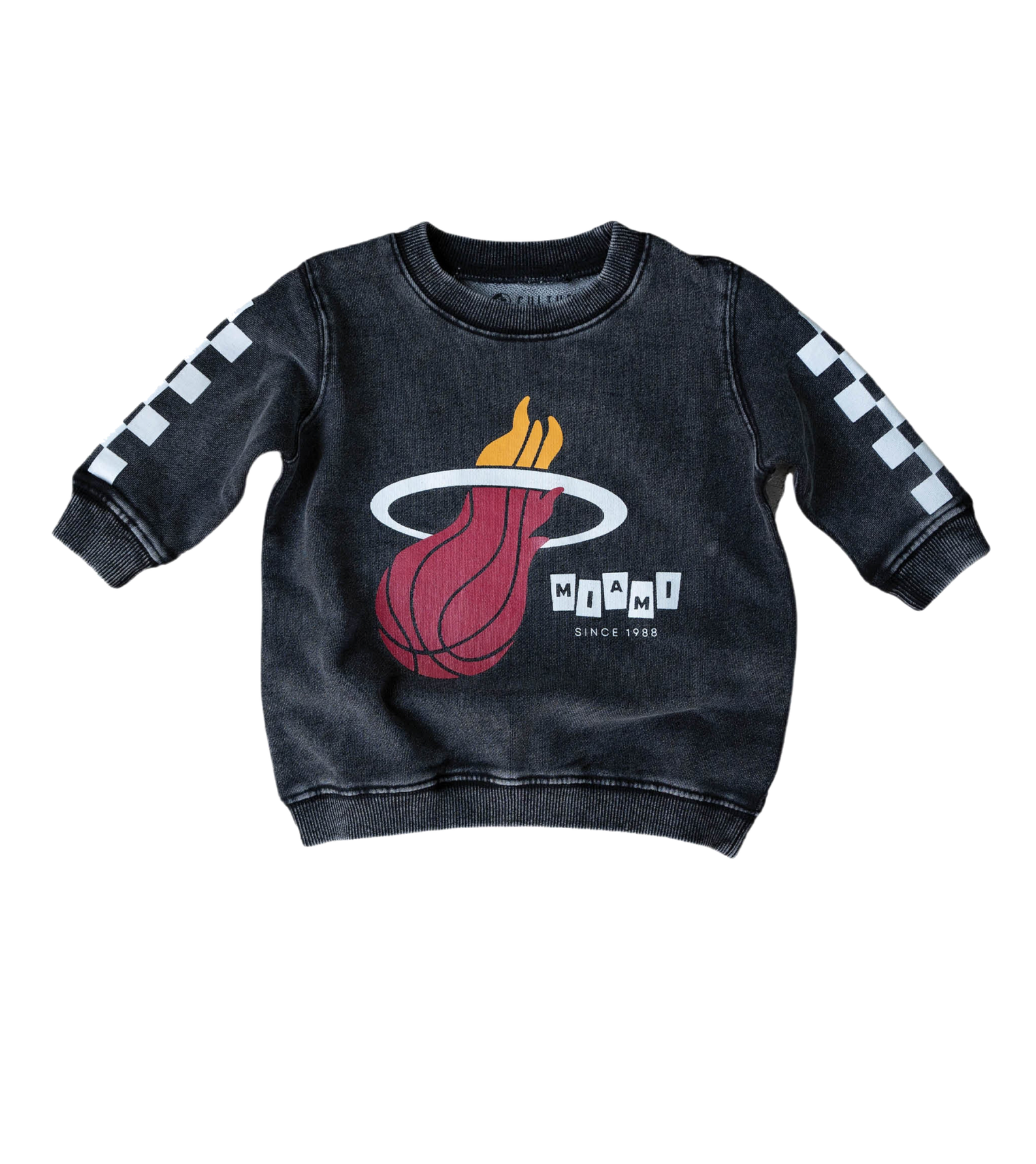 Kids black pullover with white checkerboard sleeves and Miami Heat flaming basketball graphic on front.