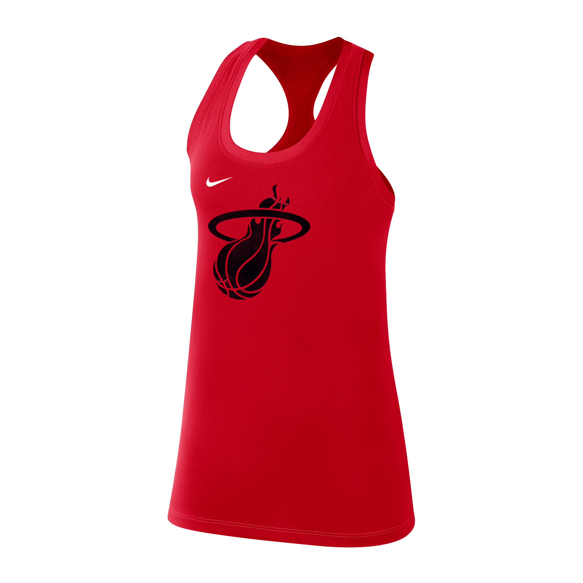 Red Nike women's tank top with black Miami Heat logo and white Nike swoosh on chest.
