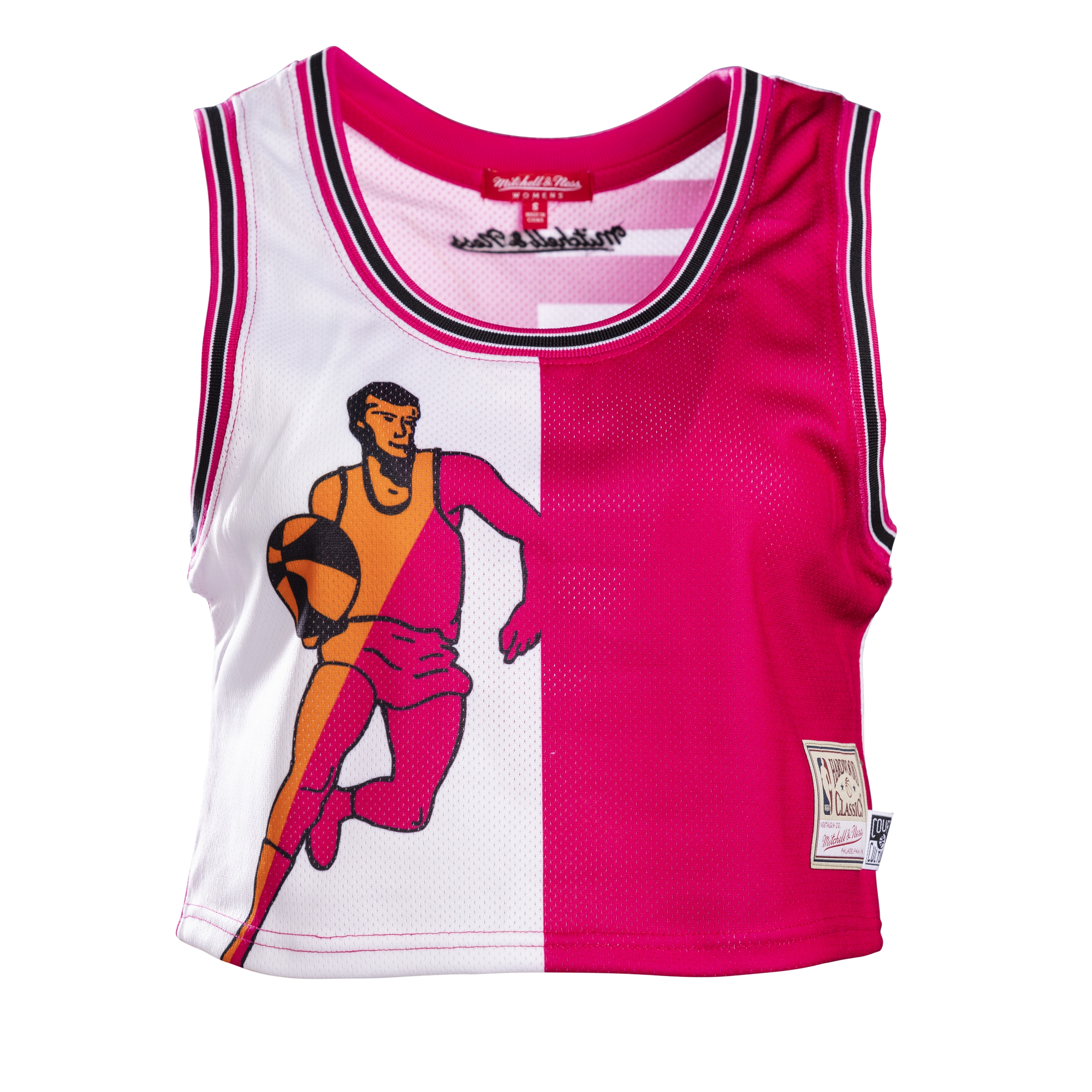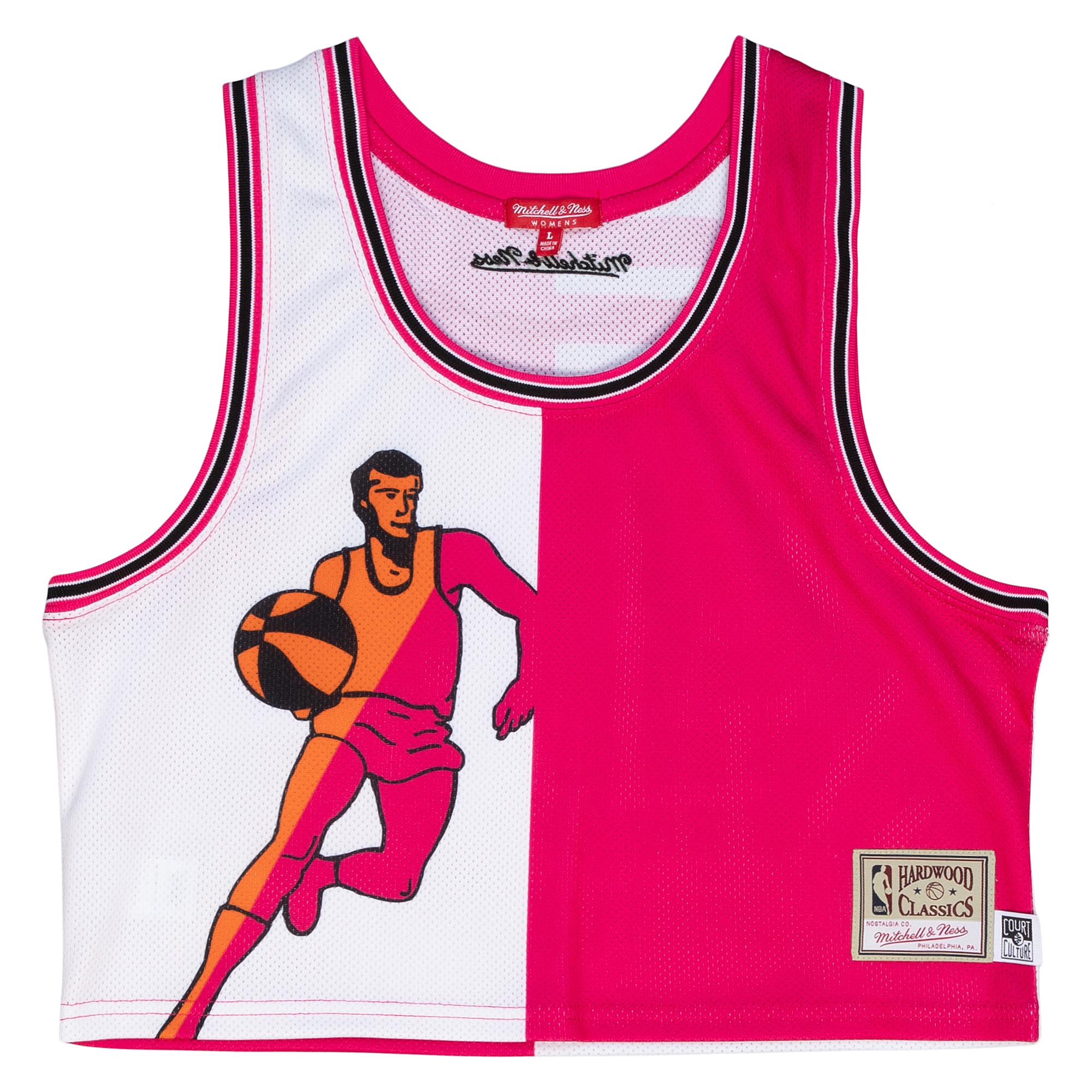 Miami HEAT mesh crop tank with pink and white color block and basketball player graphic. - Court Culture X Mitchell and Ness Floridians Mesh Crop Tank