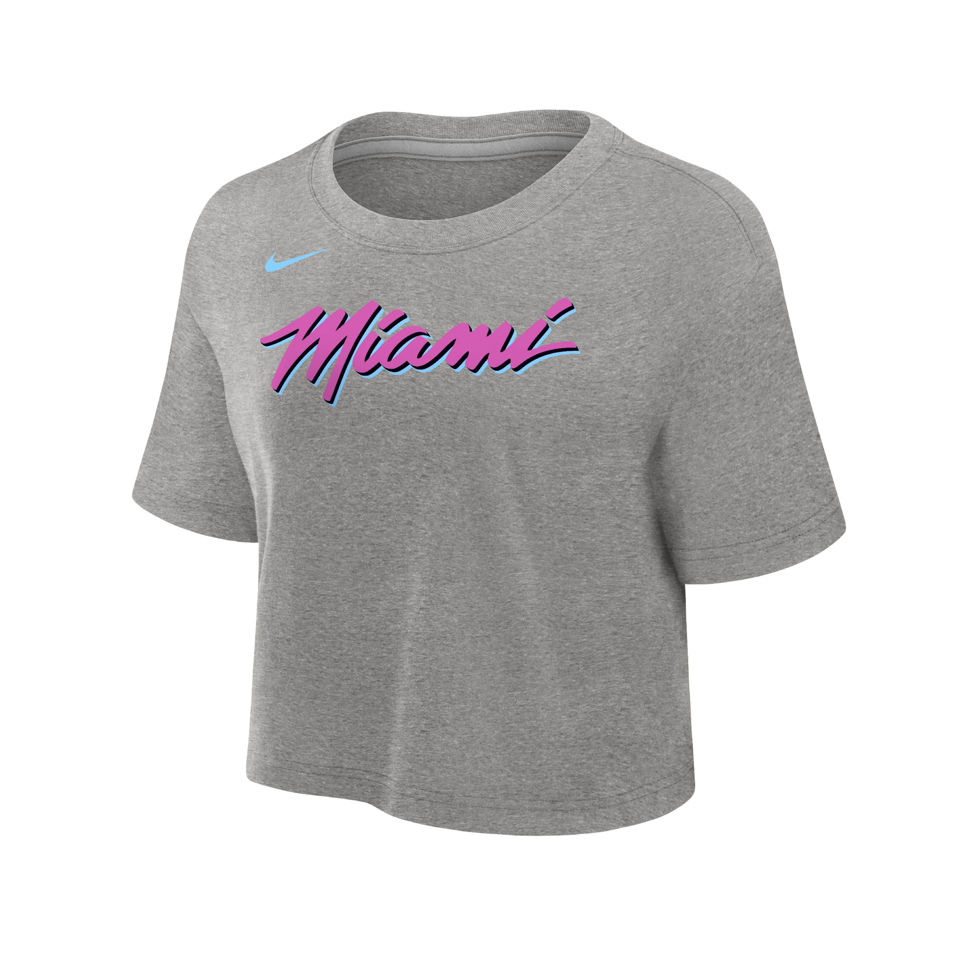 Gray cropped women's tee with Miami HEAT script in pink and blue Nike swoosh on shoulder. - Nike Miami HEAT Original Vice Women's Cropped Tee