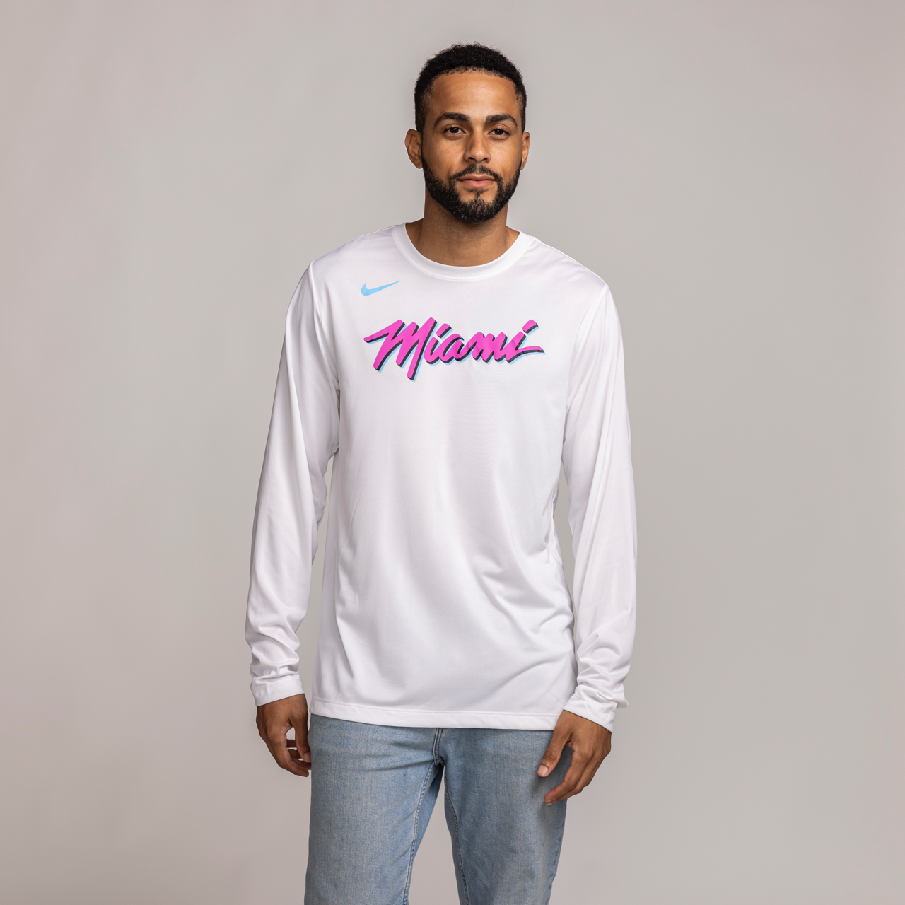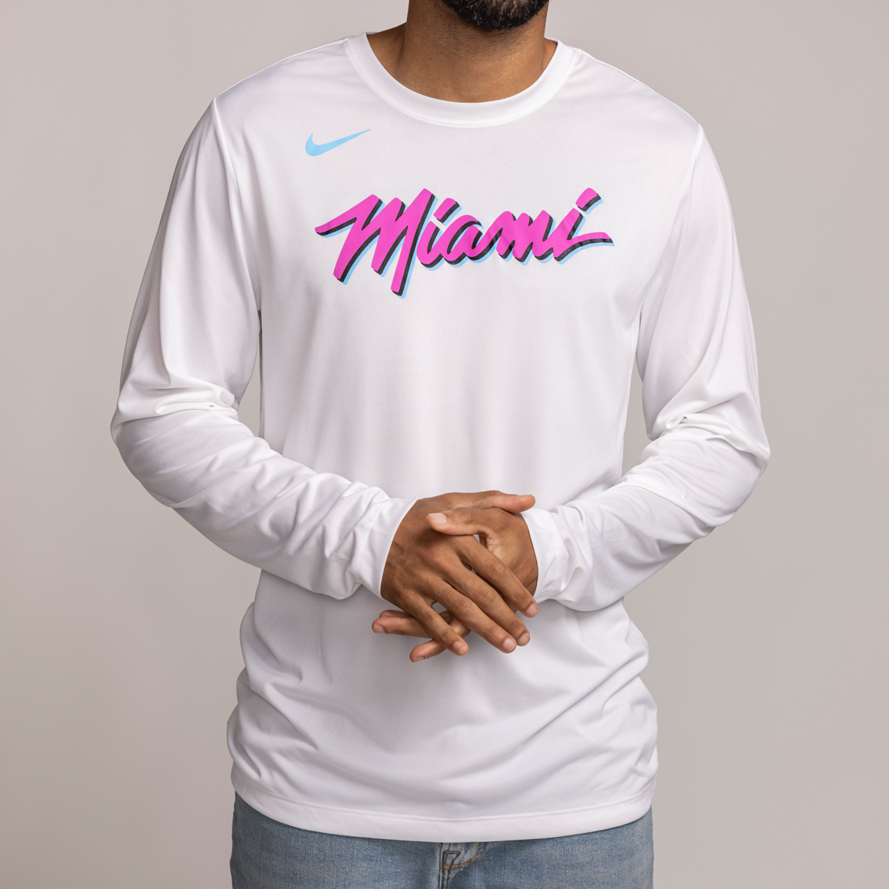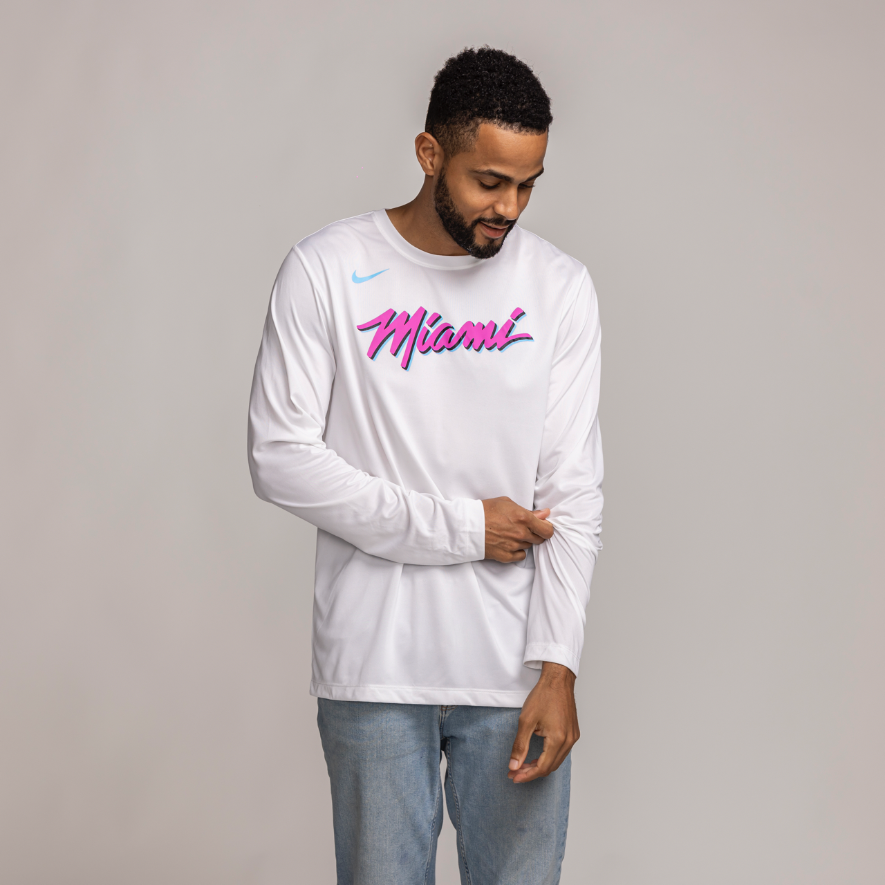 White long sleeve tee with Miami HEAT logo, slim fit, soft fabric, men's style. - Nike Miami HEAT Original Vice Long Sleeve Tee