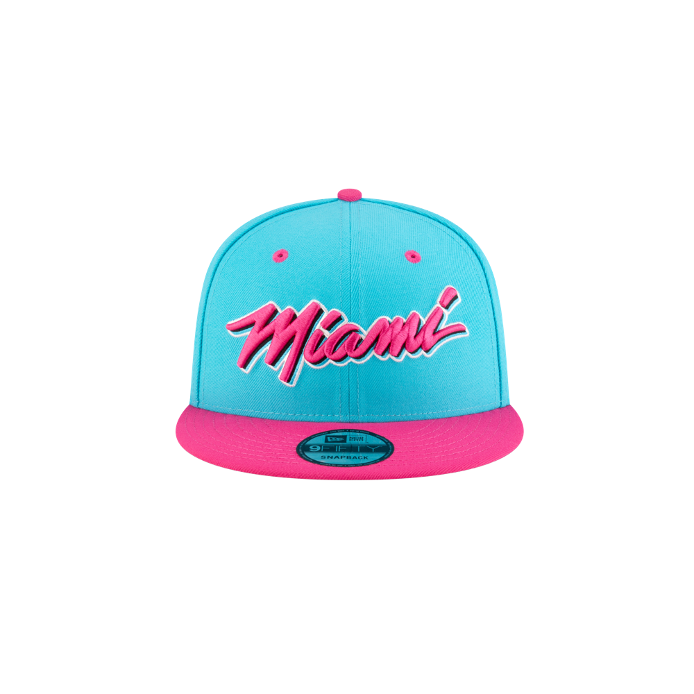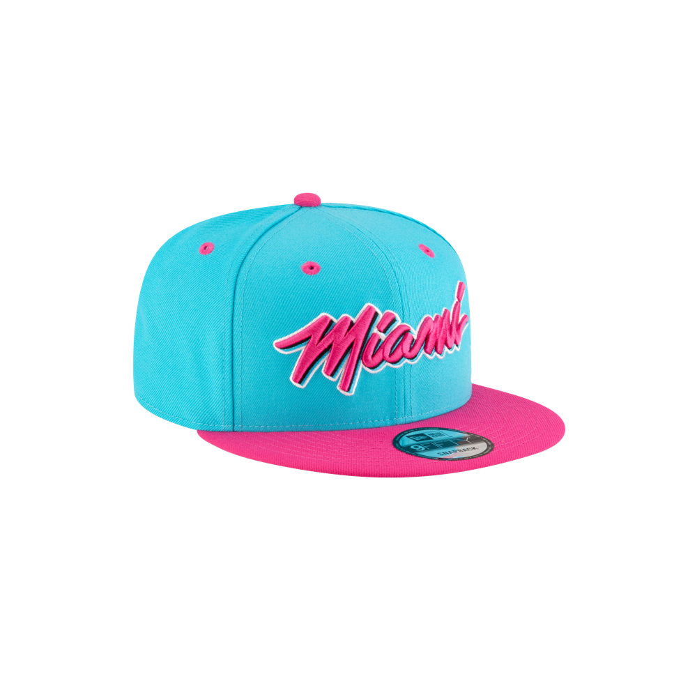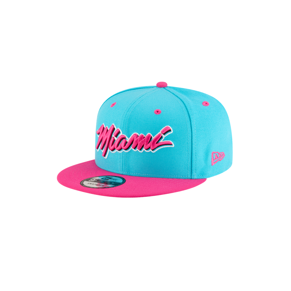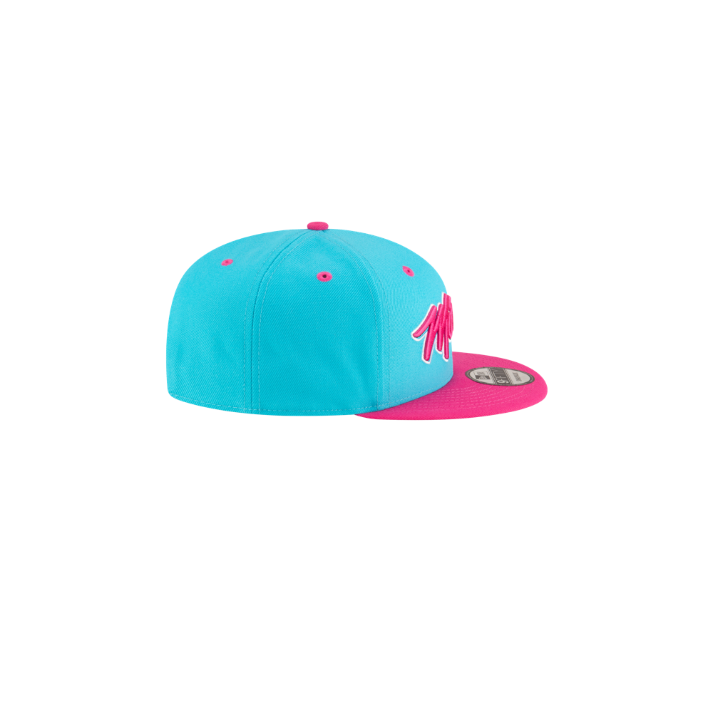 Bright blue snapback cap with pink flat brim and Miami HEAT logo embroidered in pink. - Court Culture Original Vice