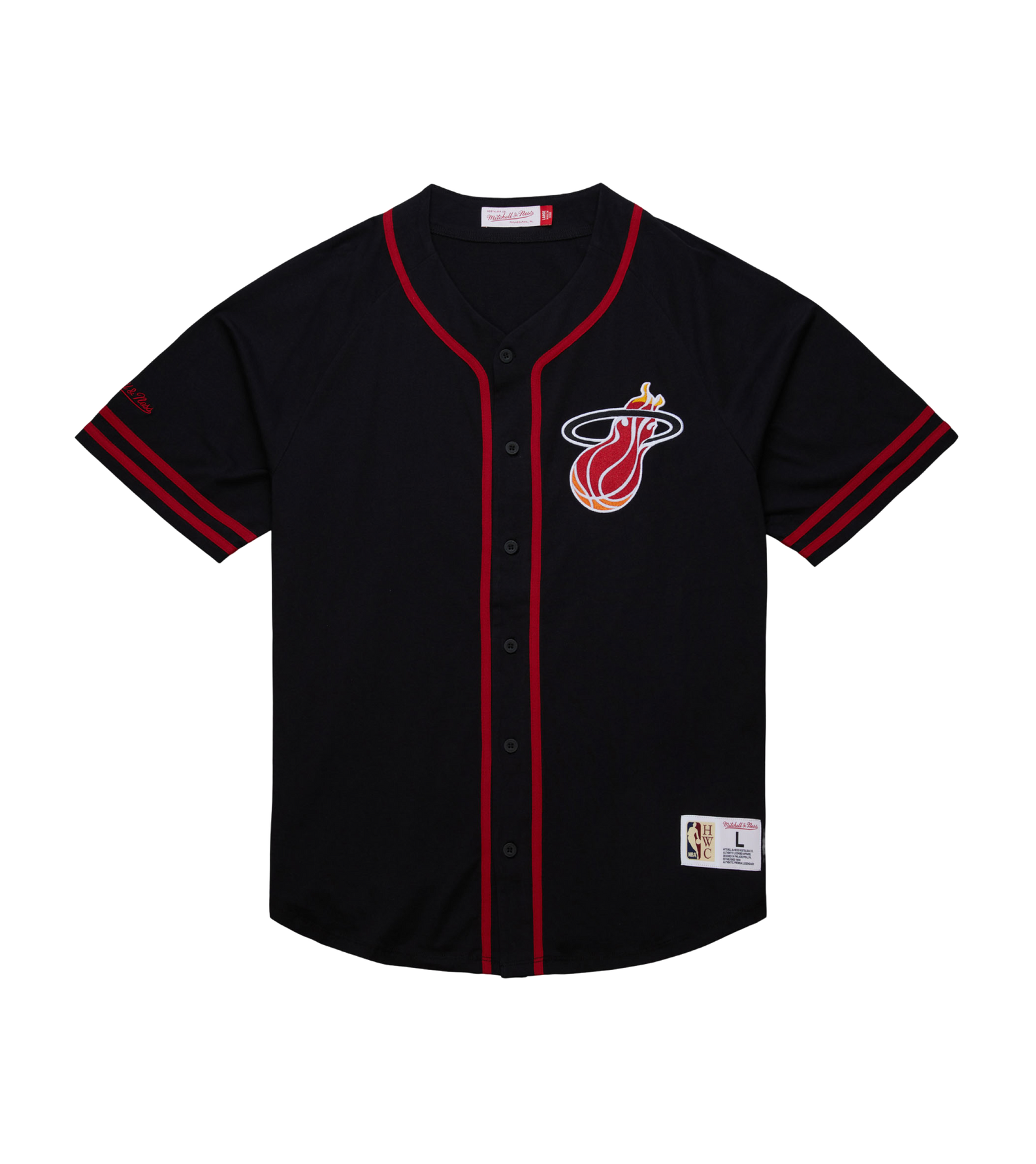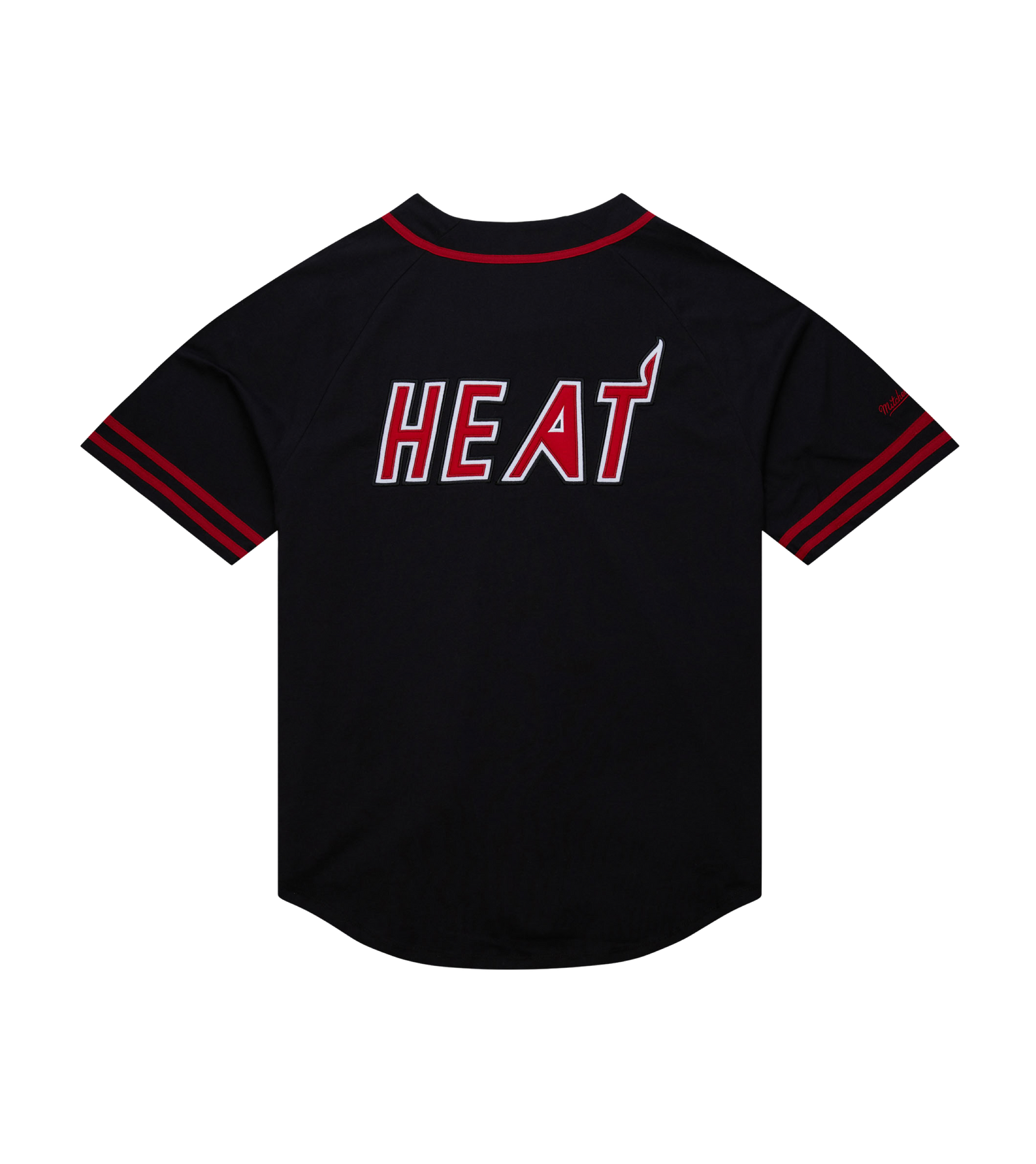 Black Miami HEAT button-down tee with red and white trim on sleeves and logo across chest. - Mitchell & Ness Miami HEAT Button Down Tee