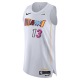 White Bam Adebayo Miami HEAT Nike Mashup Vol. 2 authentic jersey with multicolor Miami text and number 13. - Bam Adebayo Nike Miami Mashup Vol. 2 Authentic Jersey