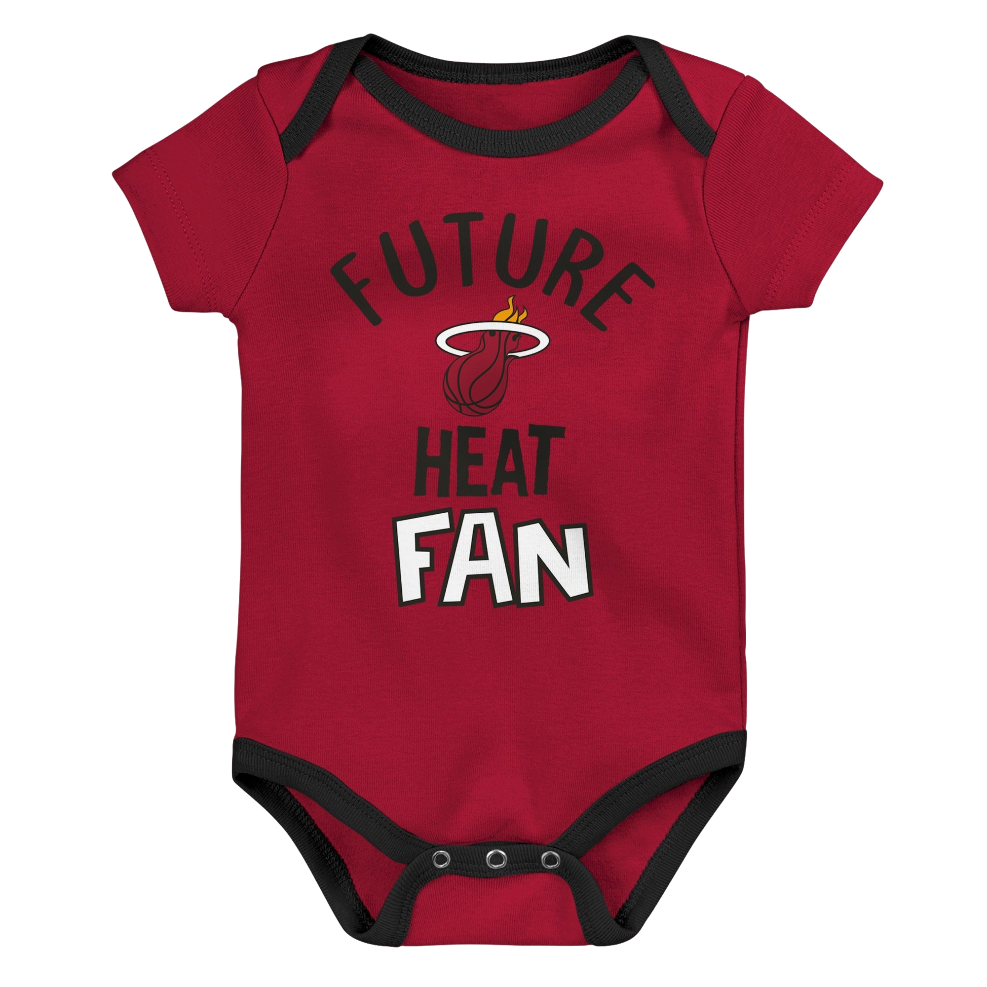 Two Miami HEAT newborn bodysuits, one black with red trim and team logo, the other red with black trim and