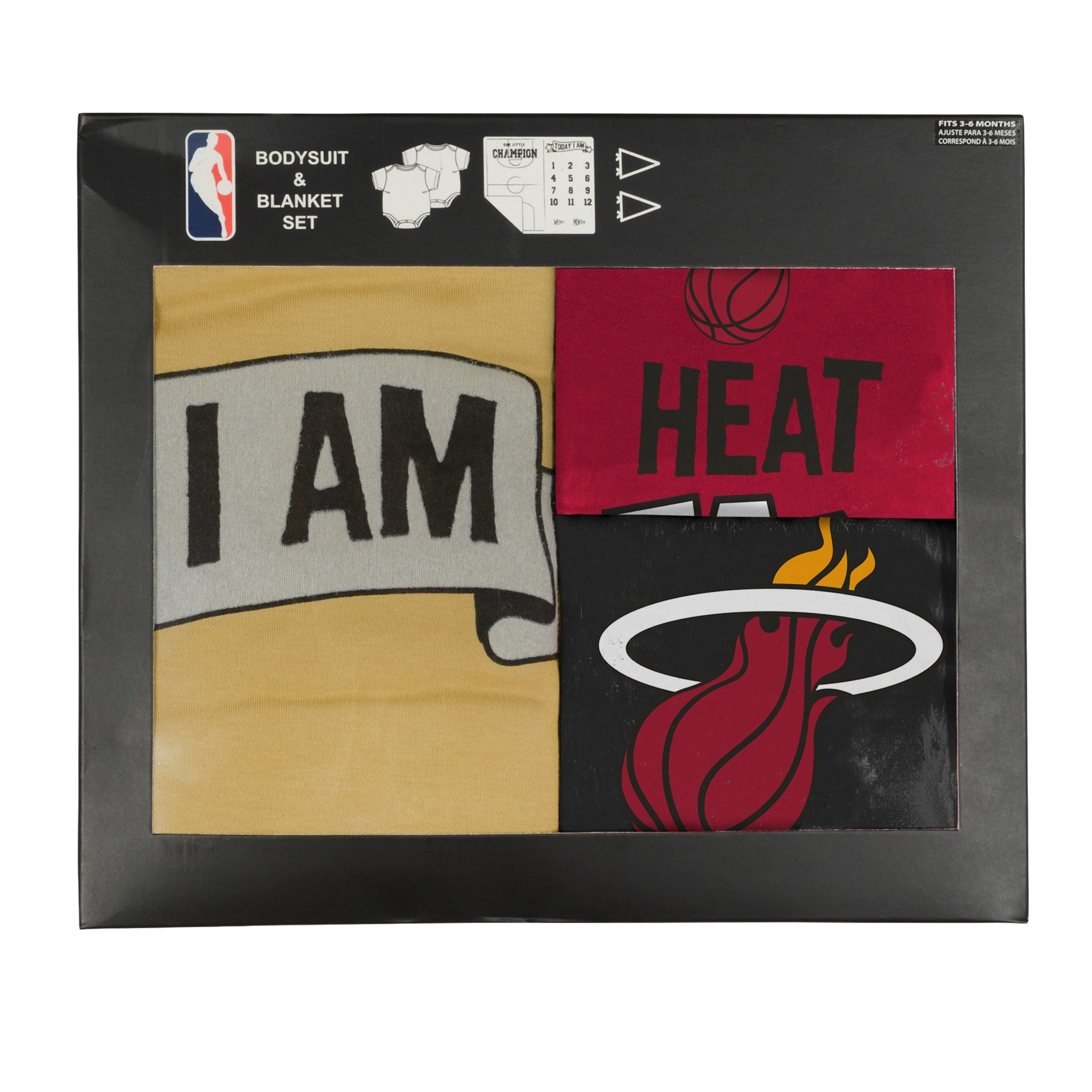 Miami HEAT newborn blanket and creeper set with black, red, and yellow team logo designs in branded box.