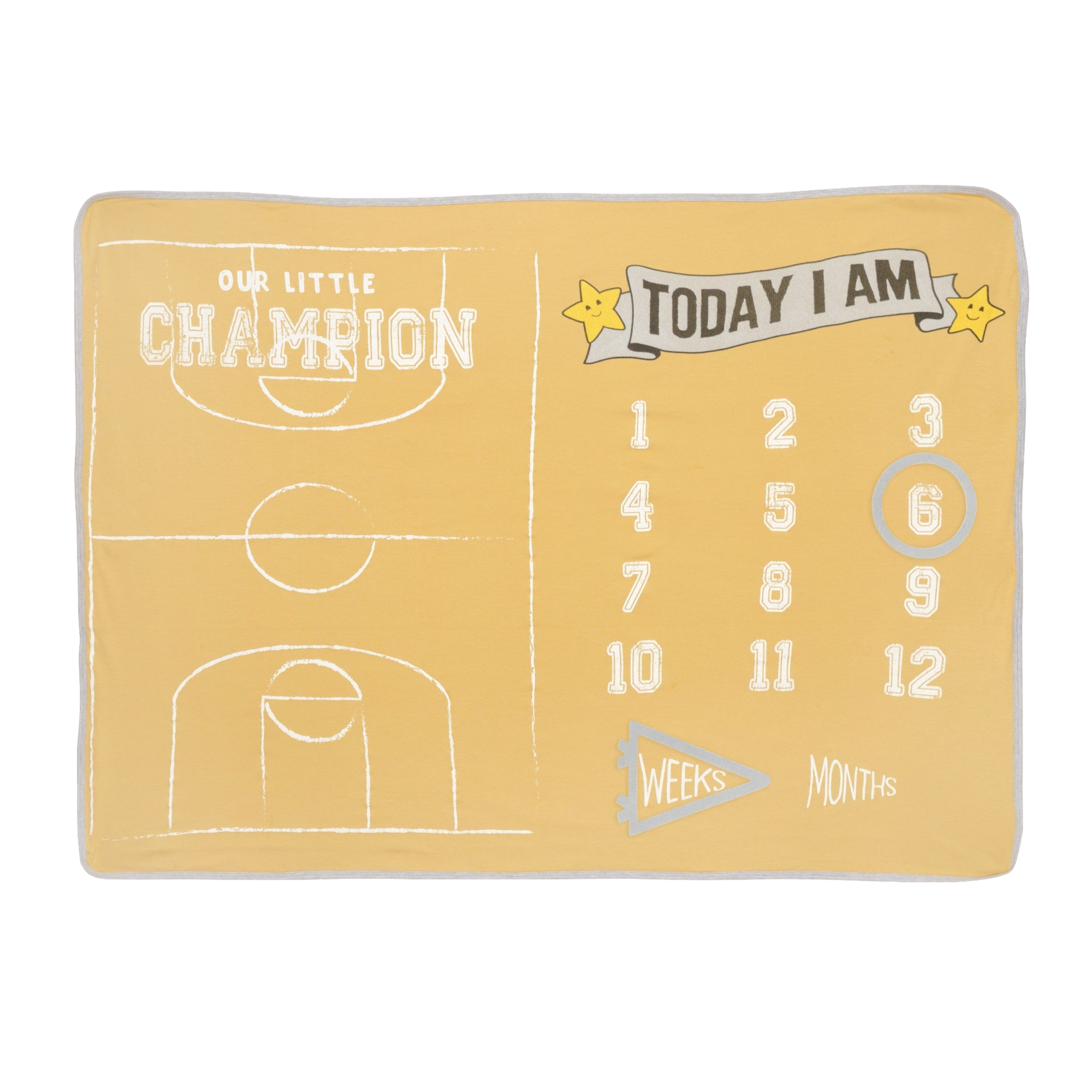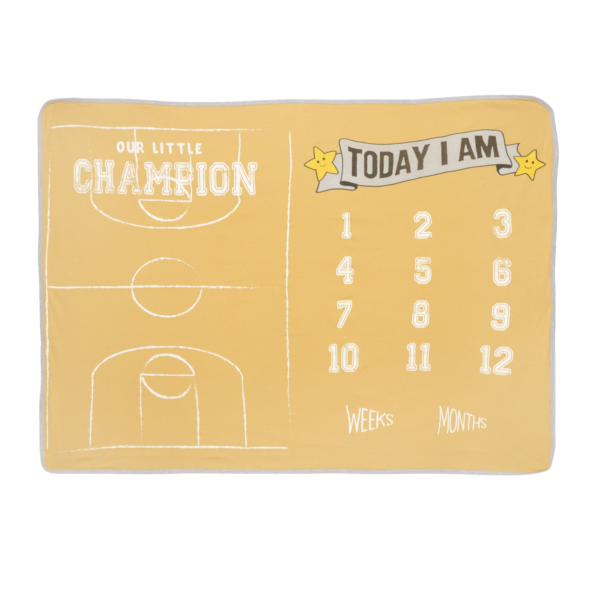 Yellow basketball-themed milestone blanket with court lines and spaces to mark baby’s age in weeks or months.