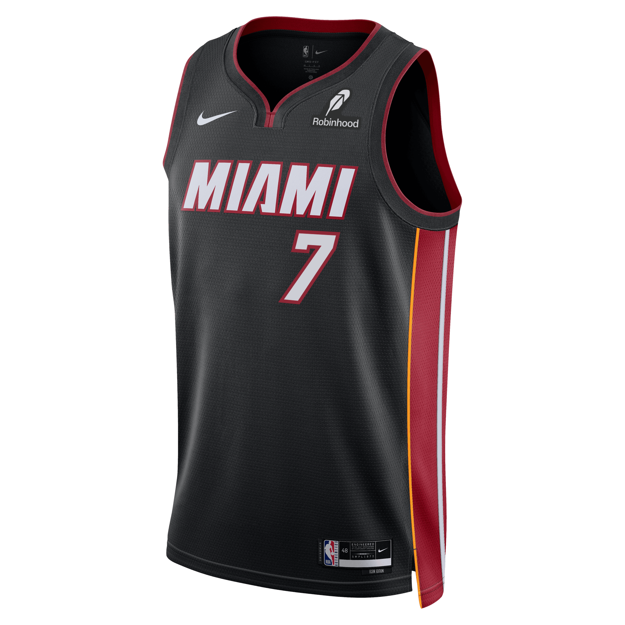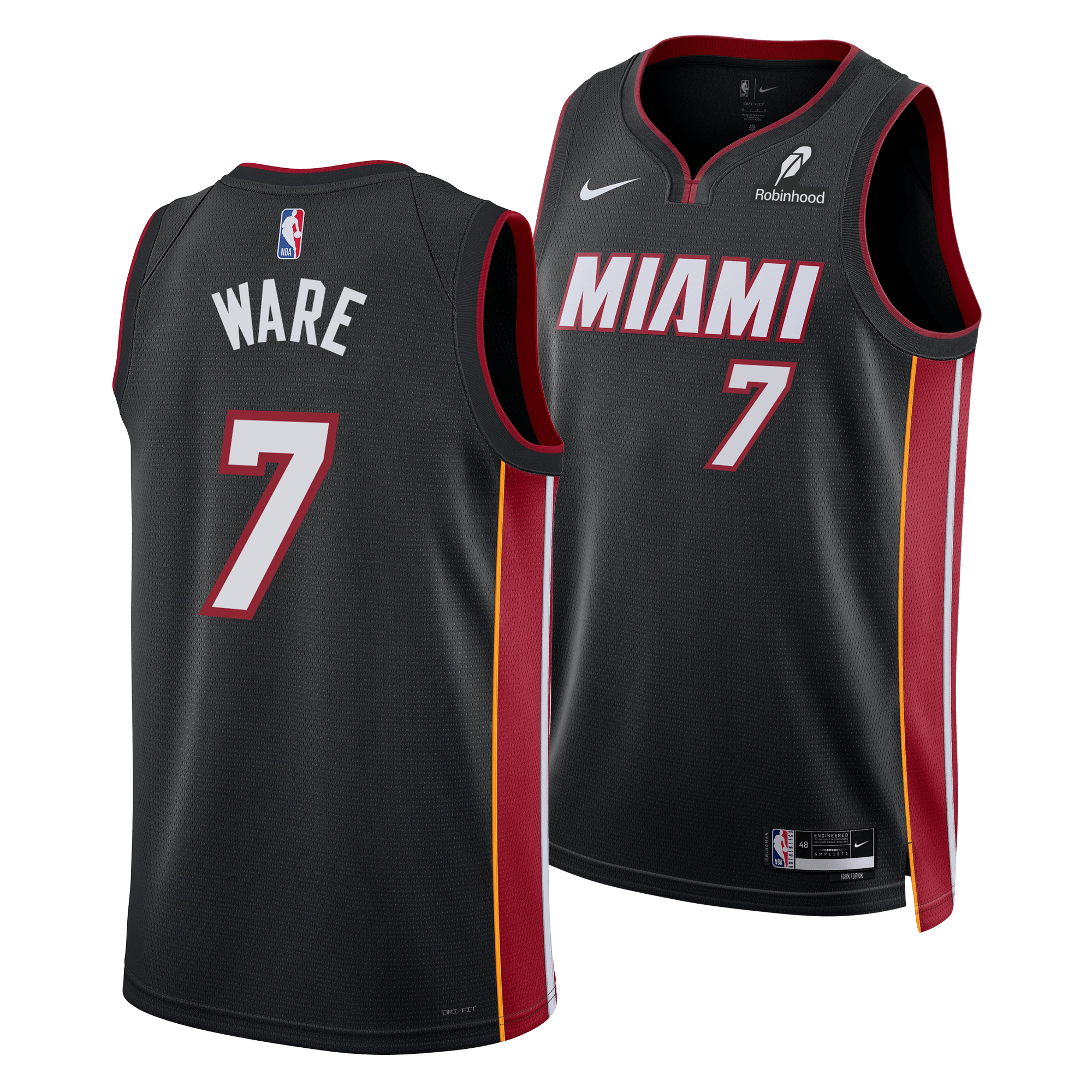 The Kel'el Ware Nike Miami HEAT Icon Black Youth Swingman Jersey features red and yellow side panels, number 7, bold MIAMI lettering, Nike and Robinhood logos, and sweat-wicking Dri-FIT technology.