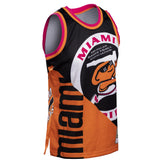 Black and orange mesh tank top with Miami HEAT Floridians graphic and pink trim on neckline and armholes. - Court Culture X Mitchell and Ness Floridians Mesh Tank