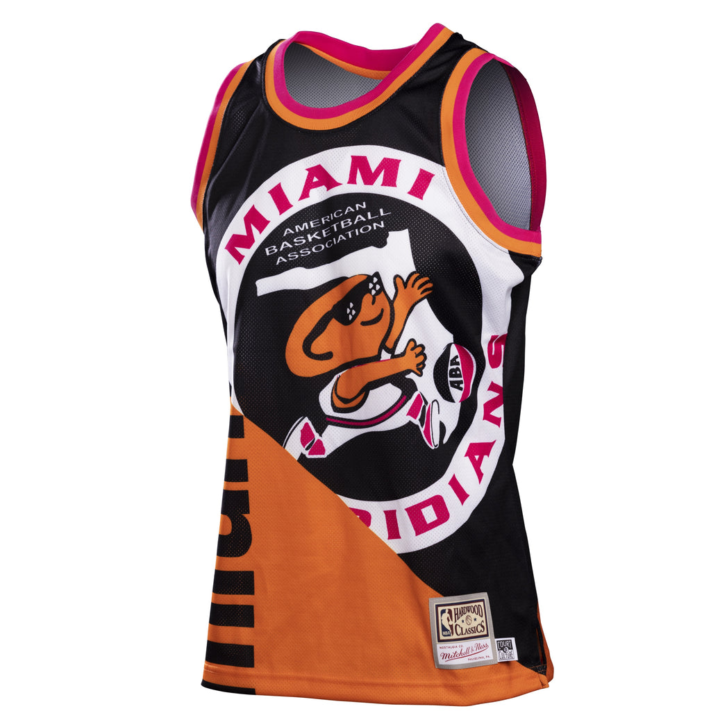 Miami HEAT black and orange mesh tank top with Miami Basketball Association graphic and striped trim. - Court Culture X Mitchell and Ness Floridians Mesh Tank