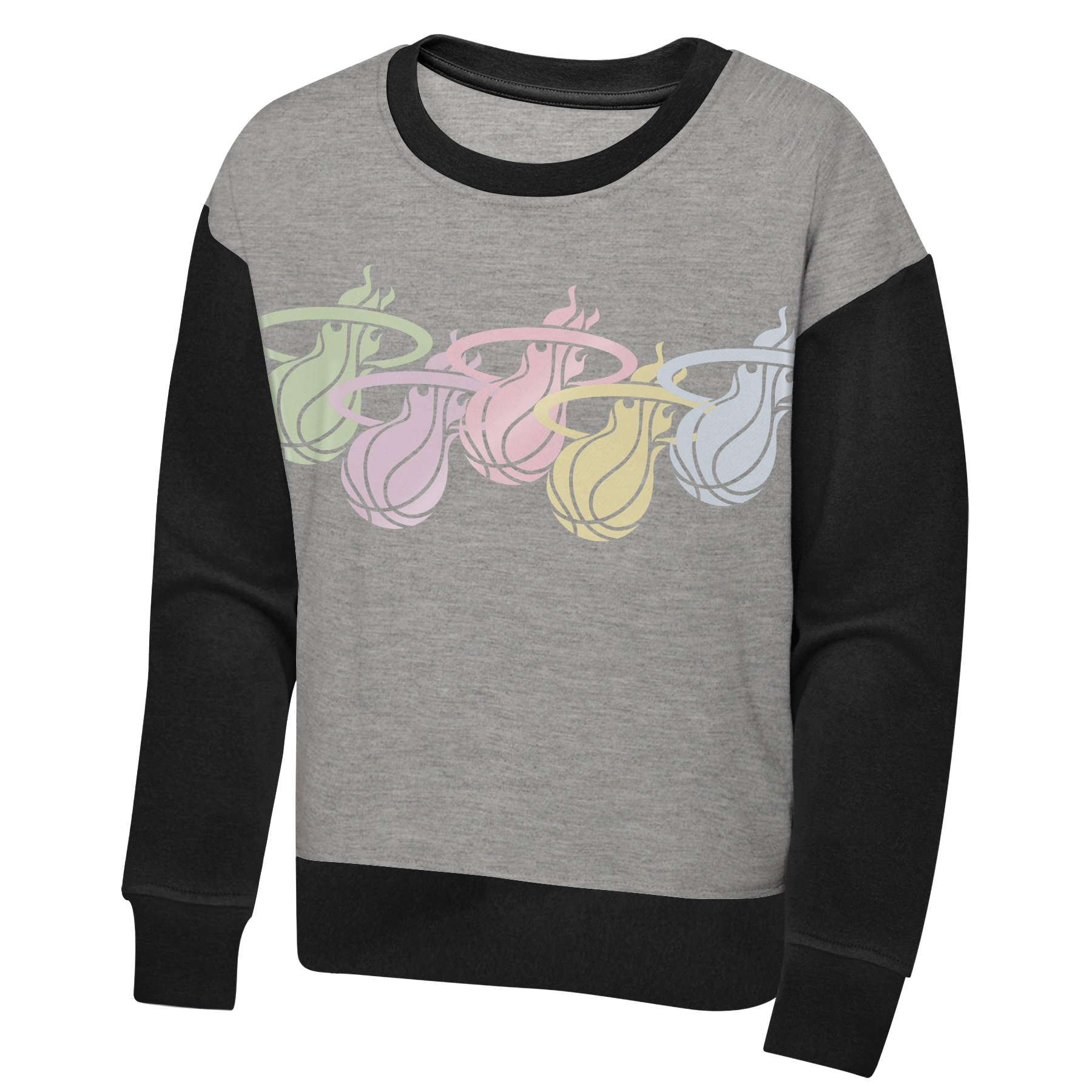 Girls' grey crewneck sweater with black sleeves and pastel multi-color graphic logo across chest.