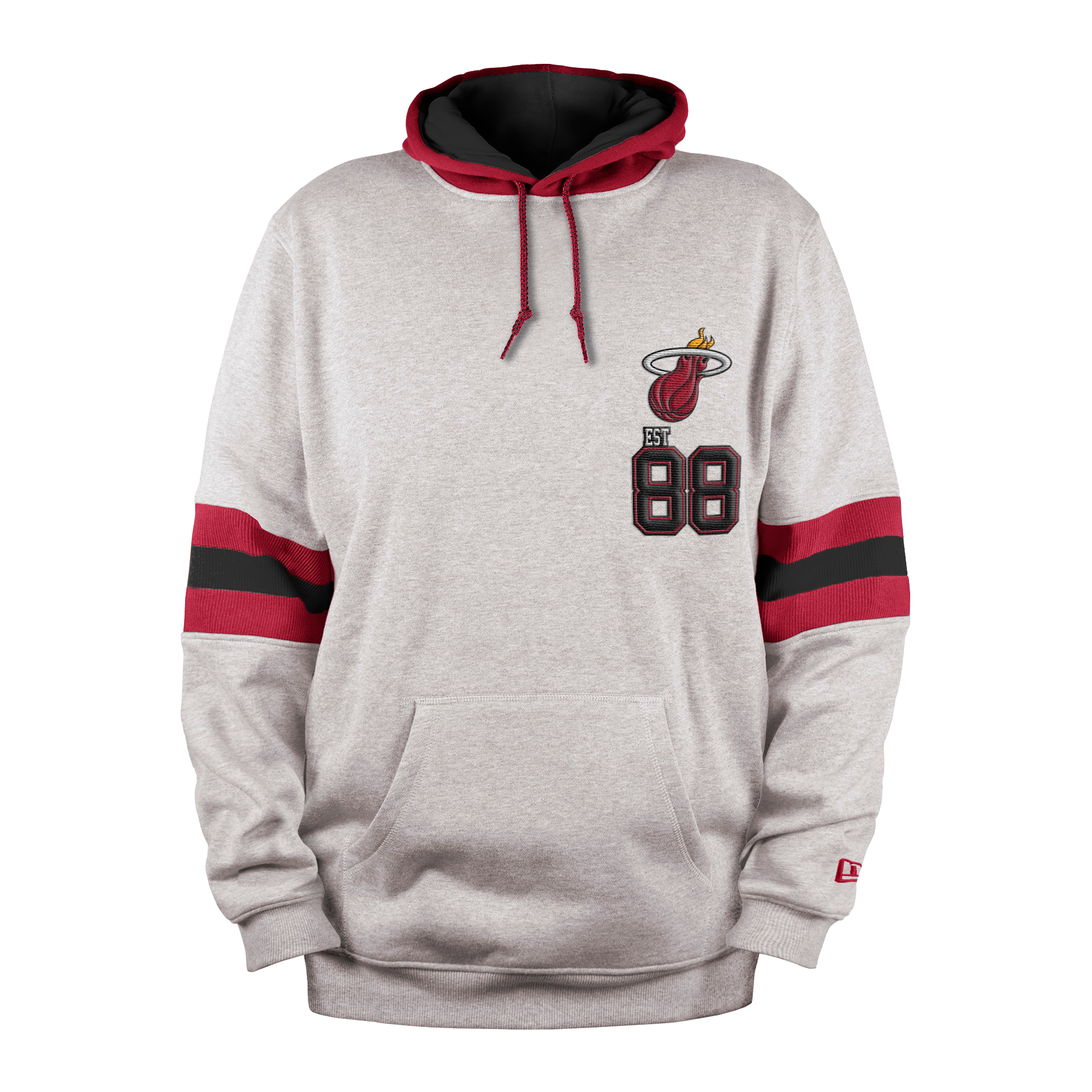 Grey Miami HEAT hoodie with red hood and bold basketball logo on back, striped sleeves. - New Era Miami HEAT 88 Hoodie