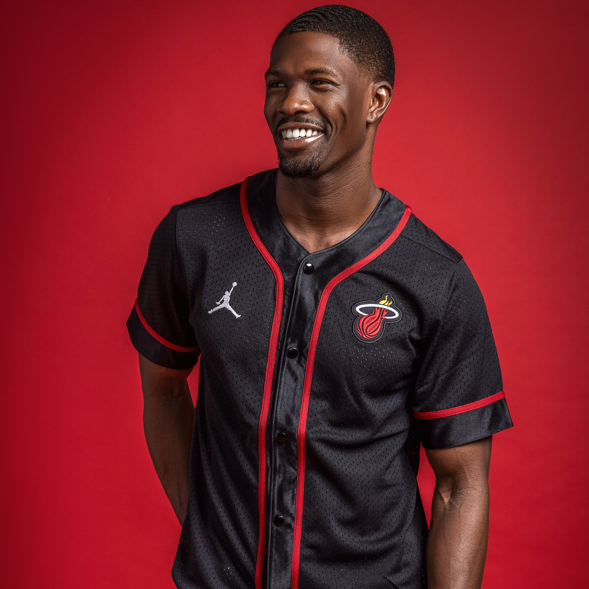 Black Miami HEAT short sleeve top with red trim and button front, Jordan Jumpman logo and team emblem. - Jordan Brand Miami HEAT Short Sleeve Top