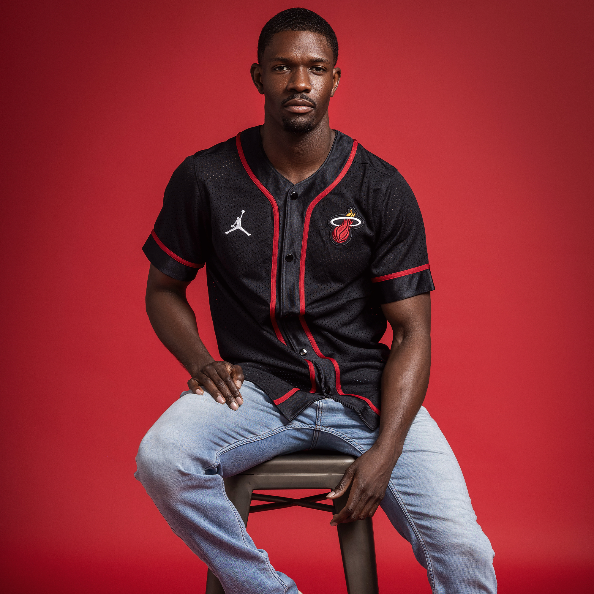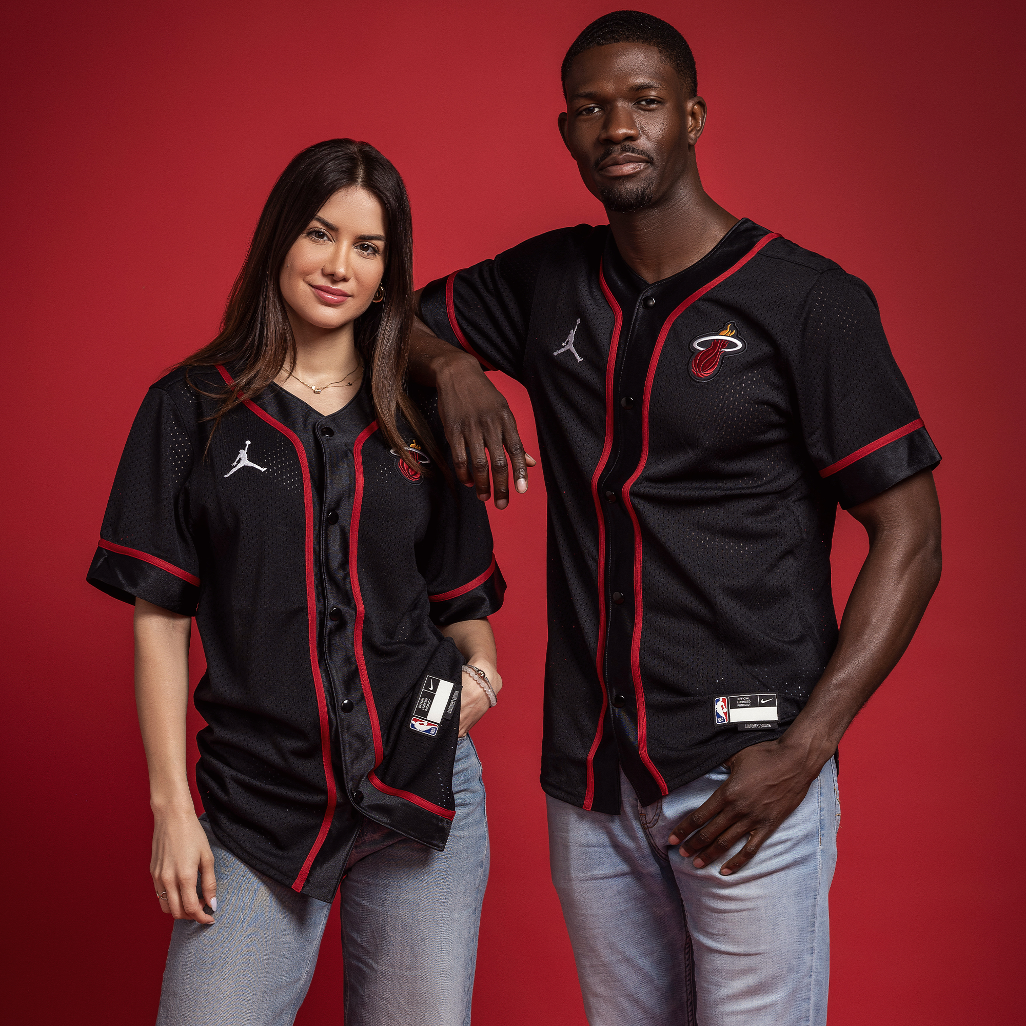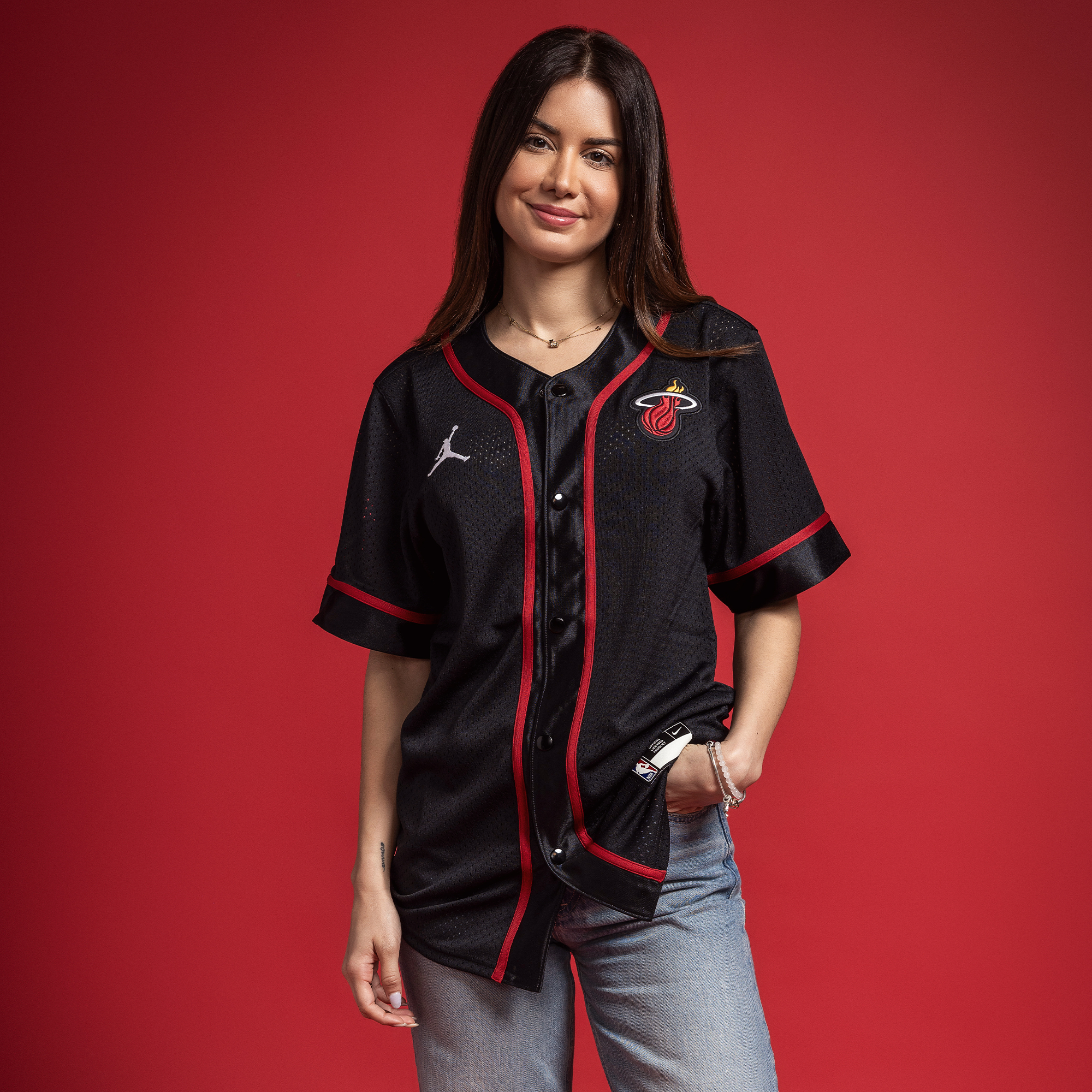 Black Jordan Miami HEAT short sleeve button-up top with red trim and logo patch on chest. - Jordan Brand Miami HEAT Short Sleeve Top