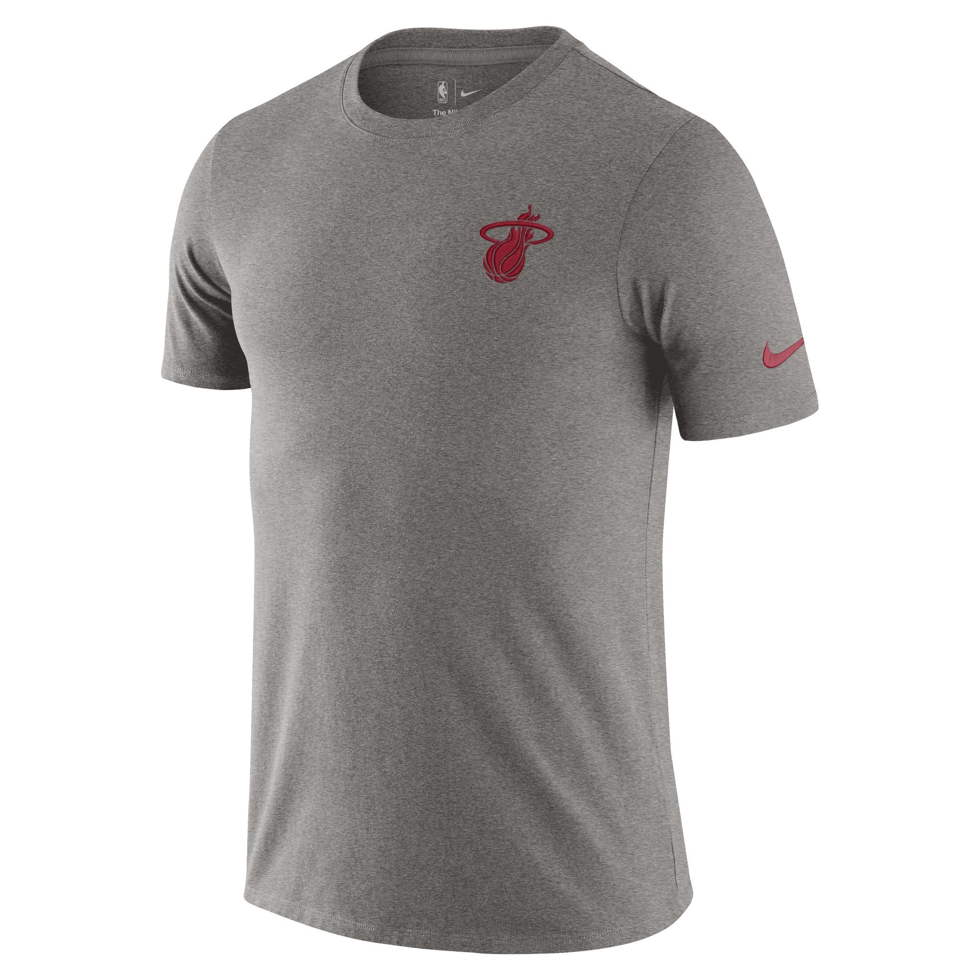 Grey Nike t-shirt with small red Miami HEAT logo on chest and red Nike swoosh on sleeve. - Nike Miami HEAT Essential Logo Tee