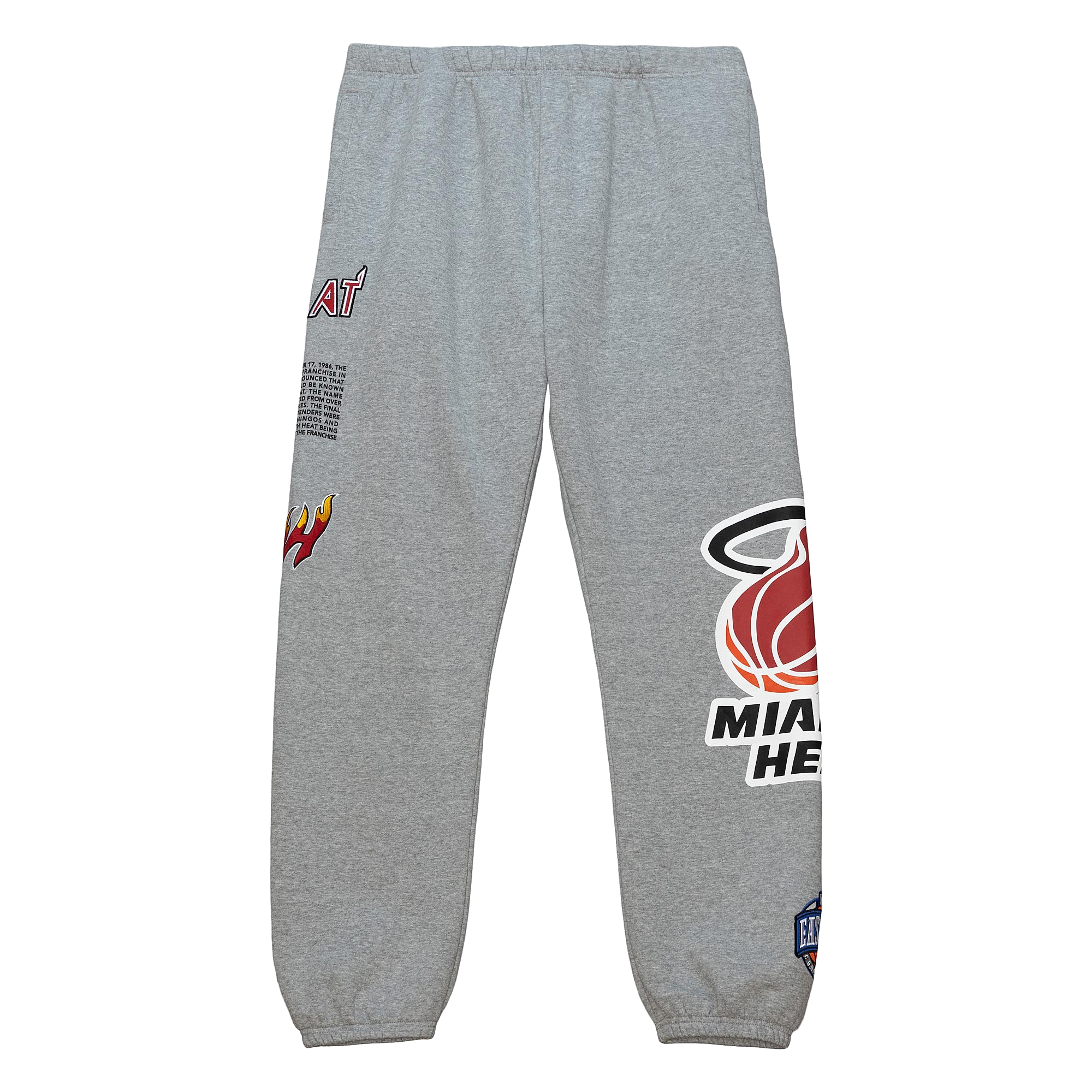 Grey fleece pants with Miami HEAT logo and flame graphics, elastic cuffs and waistband. - Mitchell and Ness Miami HEAT Origins Fleece Pants