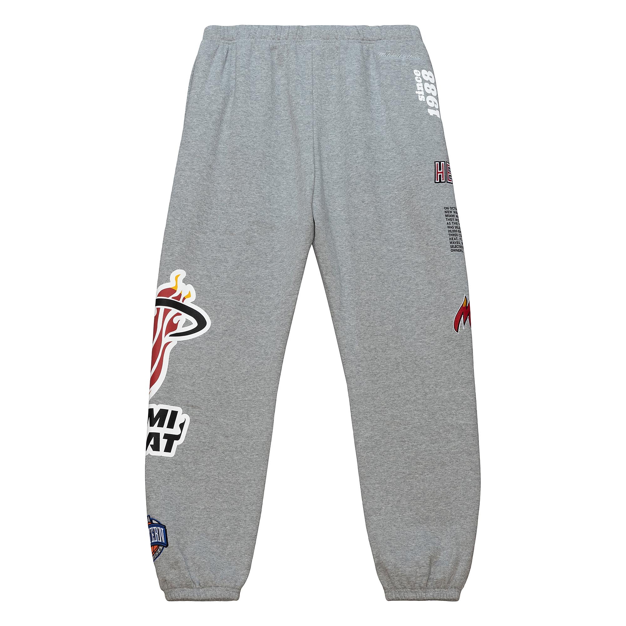 Grey fleece Miami HEAT pants with elastic cuffs and multiple team logo patches. - Mitchell and Ness Miami HEAT Origins Fleece Pants