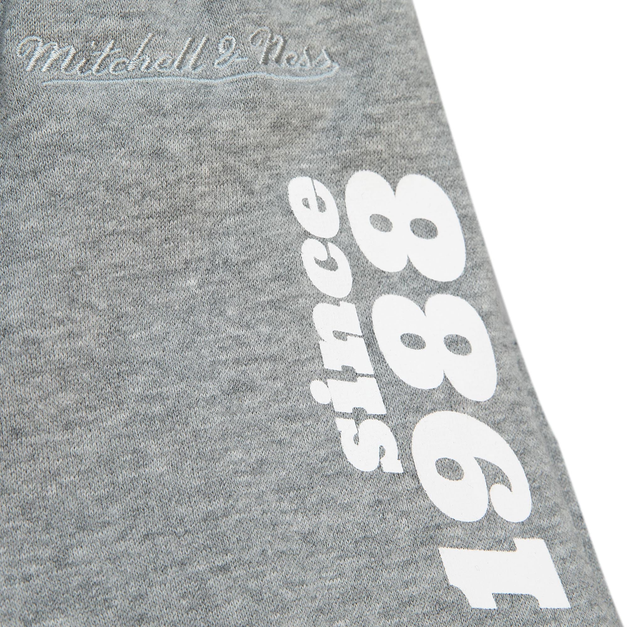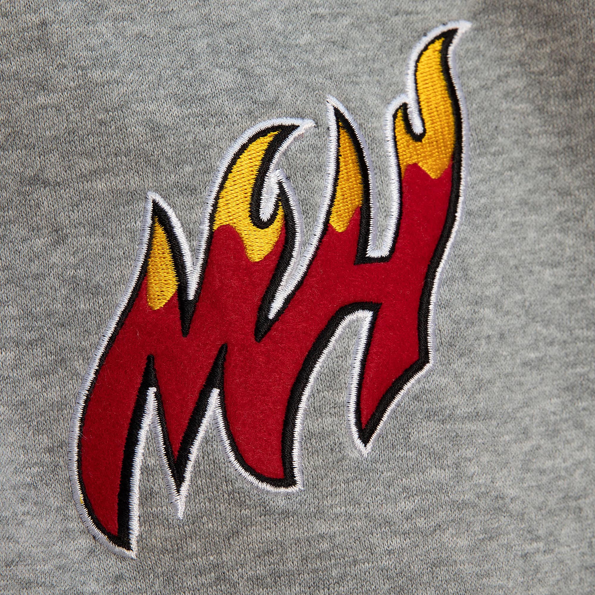 Grey fleece pants with red and yellow Miami HEAT flame logo embroidery. - Mitchell and Ness Miami HEAT Origins Fleece Pants