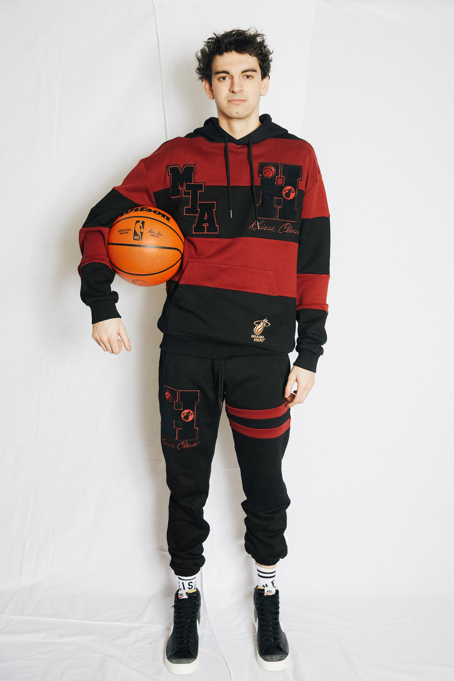 Black Miami HEAT sweatpants with team logo on left thigh, worn with red and black hoodie and white sneakers. - Keiser Clark Miami HEAT Sweatpants