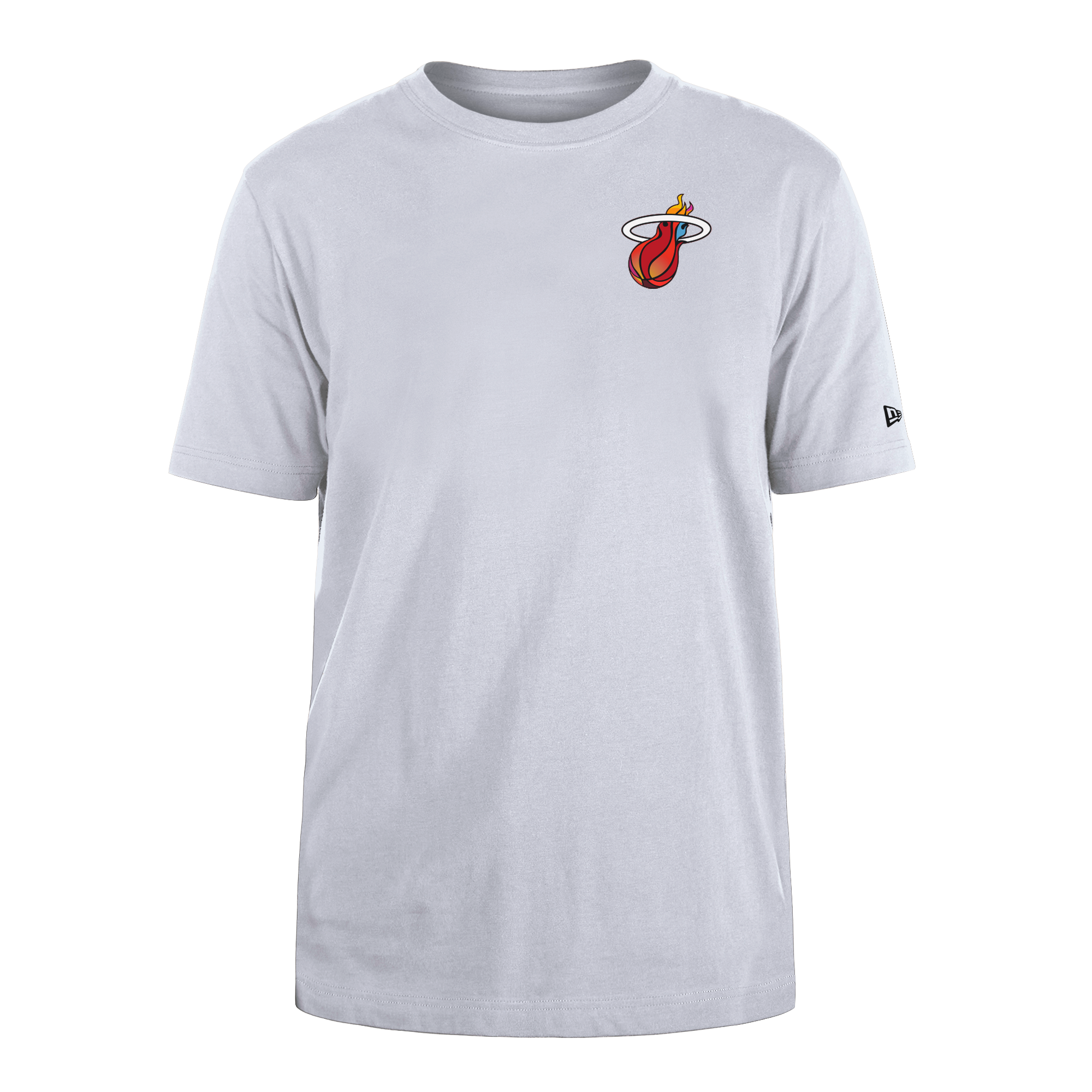 White Tyler Herro New Era tee with small Miami HEAT logo on chest and sleeve branding. - Tyler Herro New Era Miami Mashup Vol. 2 Name & Number Tee