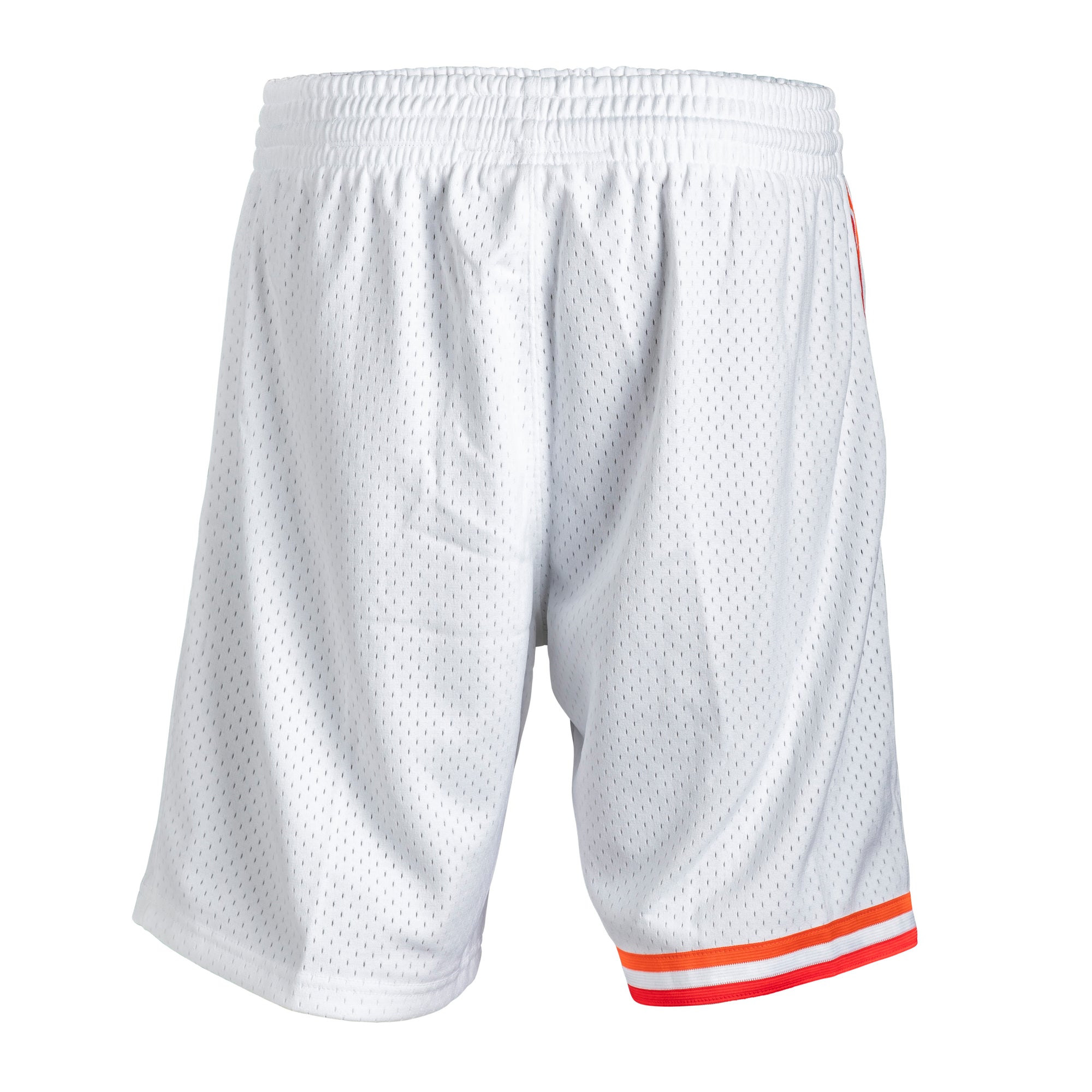 White Miami HEAT Swingman shorts with orange stripes on hem and breathable mesh fabric. - Mitchell & Ness Miami HEAT Swingman Shorts White