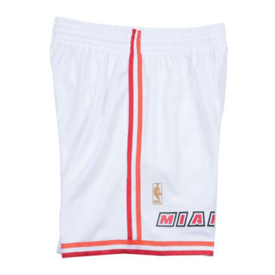 White Mitchell & Ness Miami HEAT Swingman shorts with red and black accents and Miami logo. - Mitchell & Ness Miami HEAT Swingman Shorts White