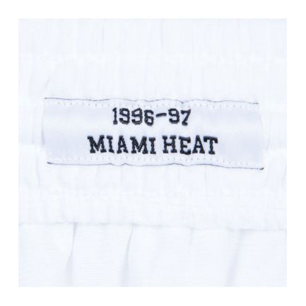 White Miami HEAT shorts label with black 1996-97 embroidery on waistband interior. - Mitchell & Ness Miami HEAT Swingman Shorts White