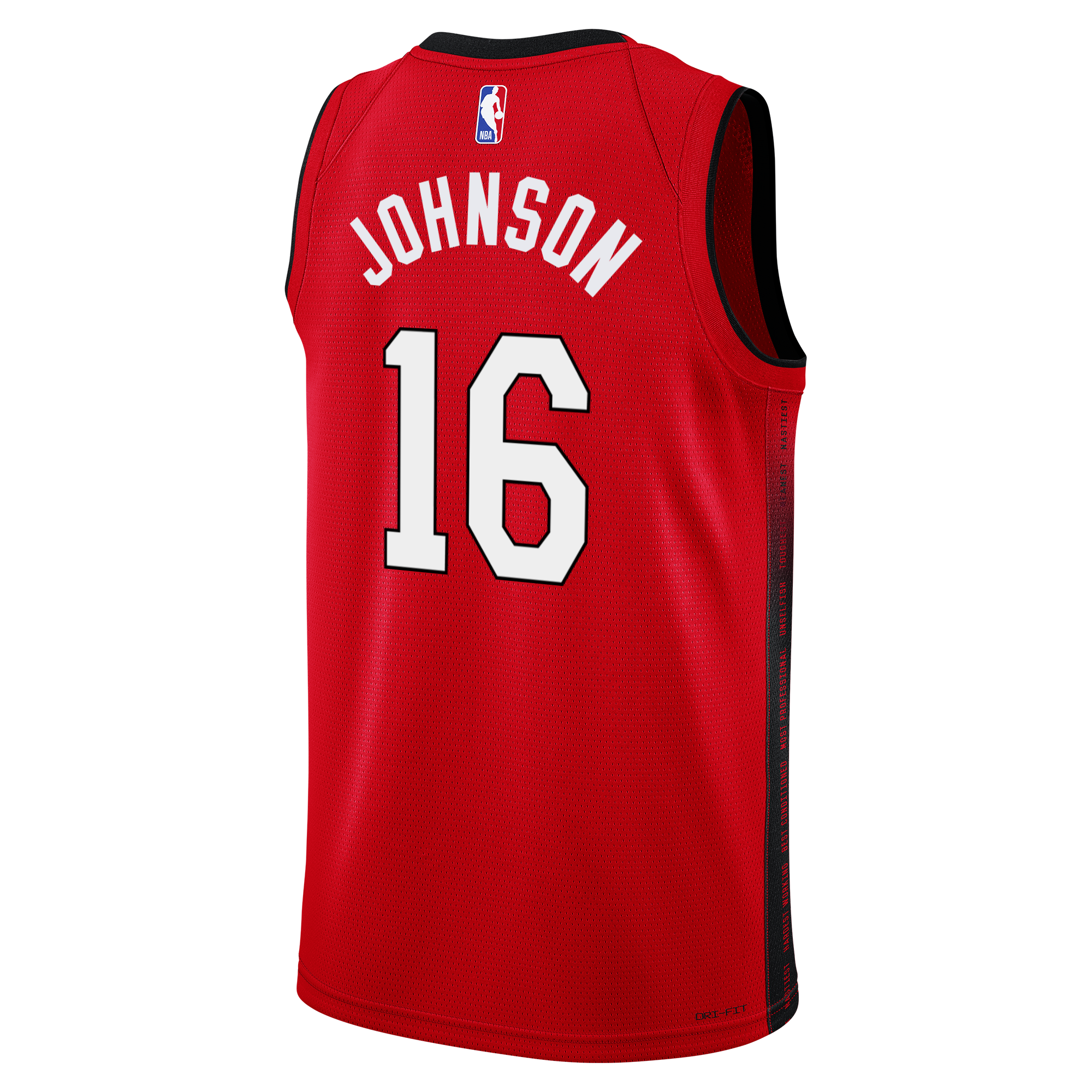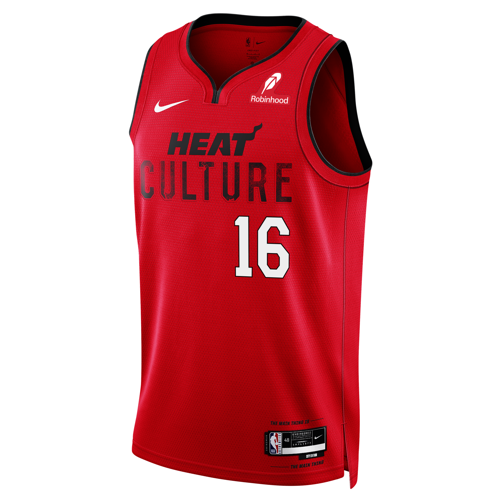 Red Miami HEAT Culture Swingman jersey with black and white lettering and number 16. - Keshad Johnson Nike HEAT Culture: Blood Red Swingman Jersey