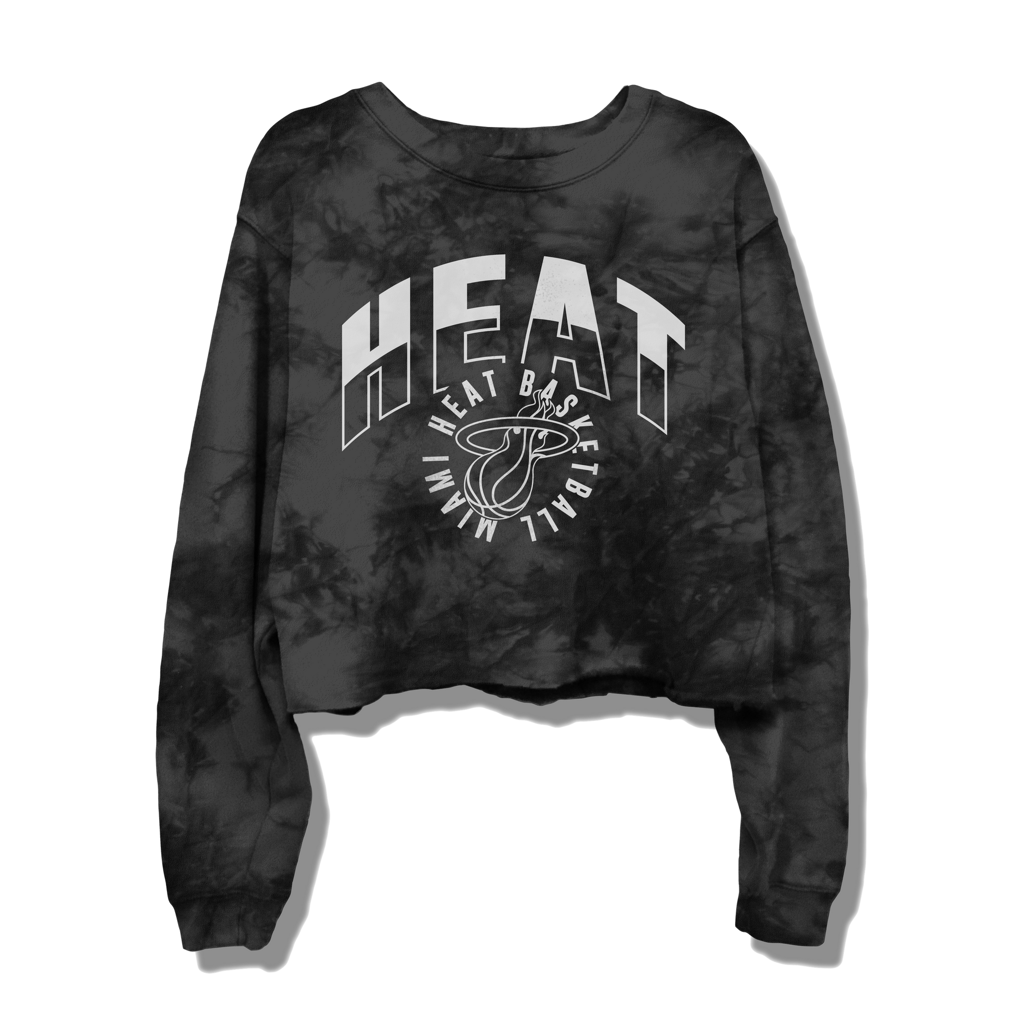 Black tie-dye cropped fleece sweatshirt with Miami HEAT logo and graphic lettering on front.