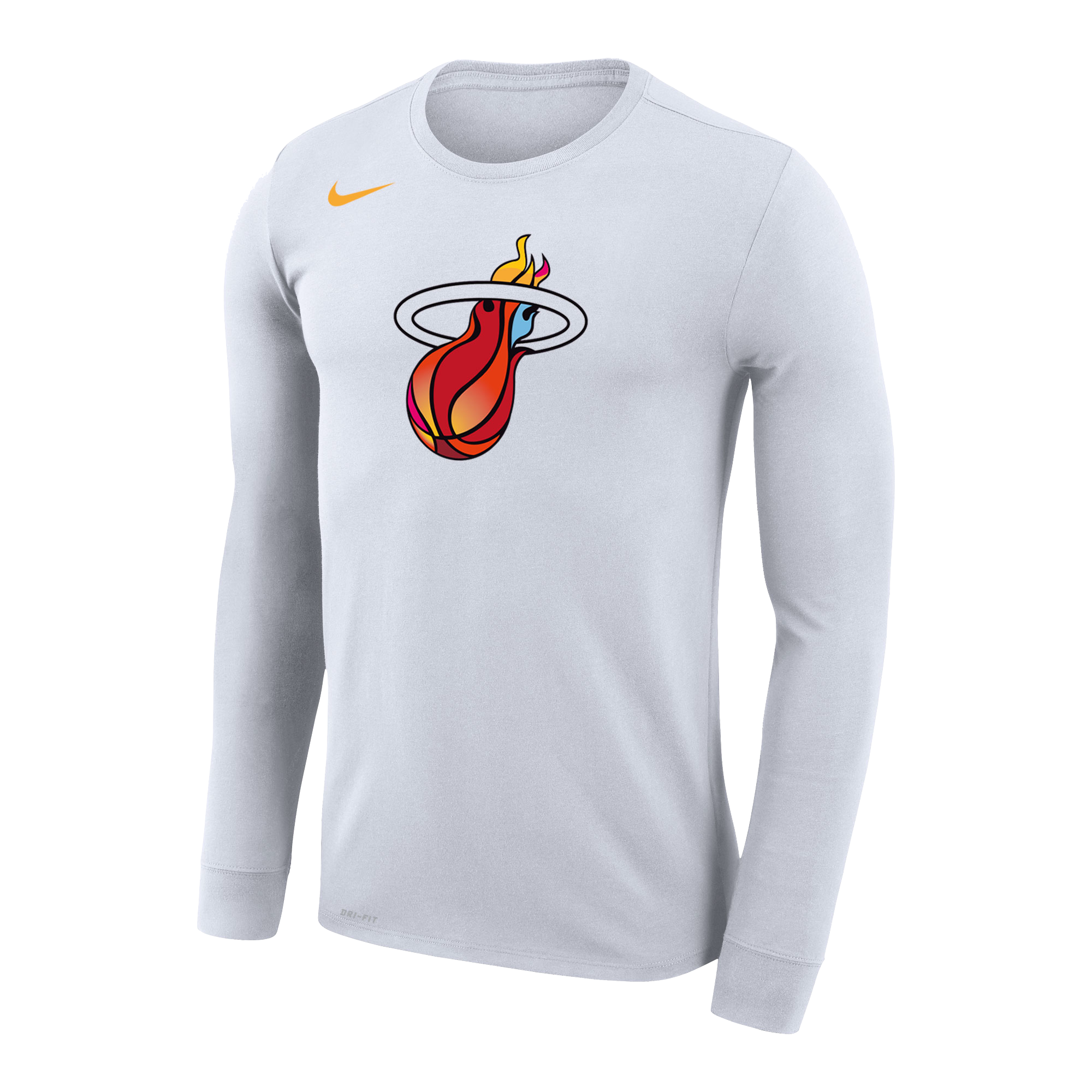 White long sleeve tee with Miami HEAT flaming basketball logo and small orange Nike swoosh. - Nike Miami Mashup Vol. 2 Logo Long Sleeve Tee