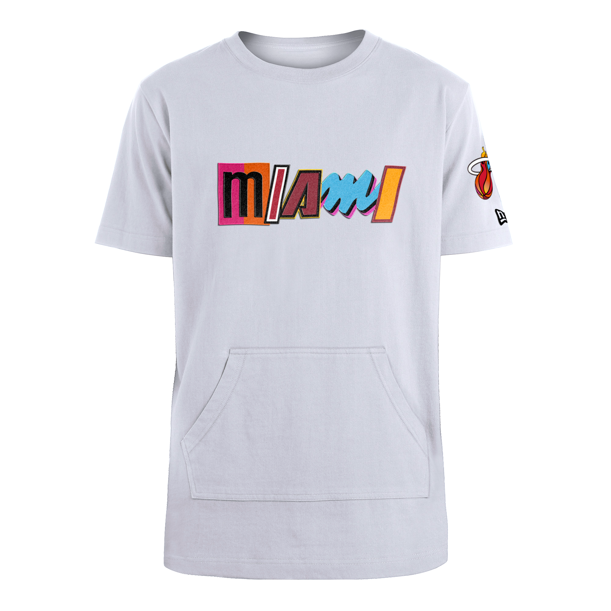 White New Era Miami Mashup Vol. 2 pocket tee with multicolor Miami text and Miami HEAT logo on sleeve. - New Era Miami Mashup Vol. 2 Pocket Tee