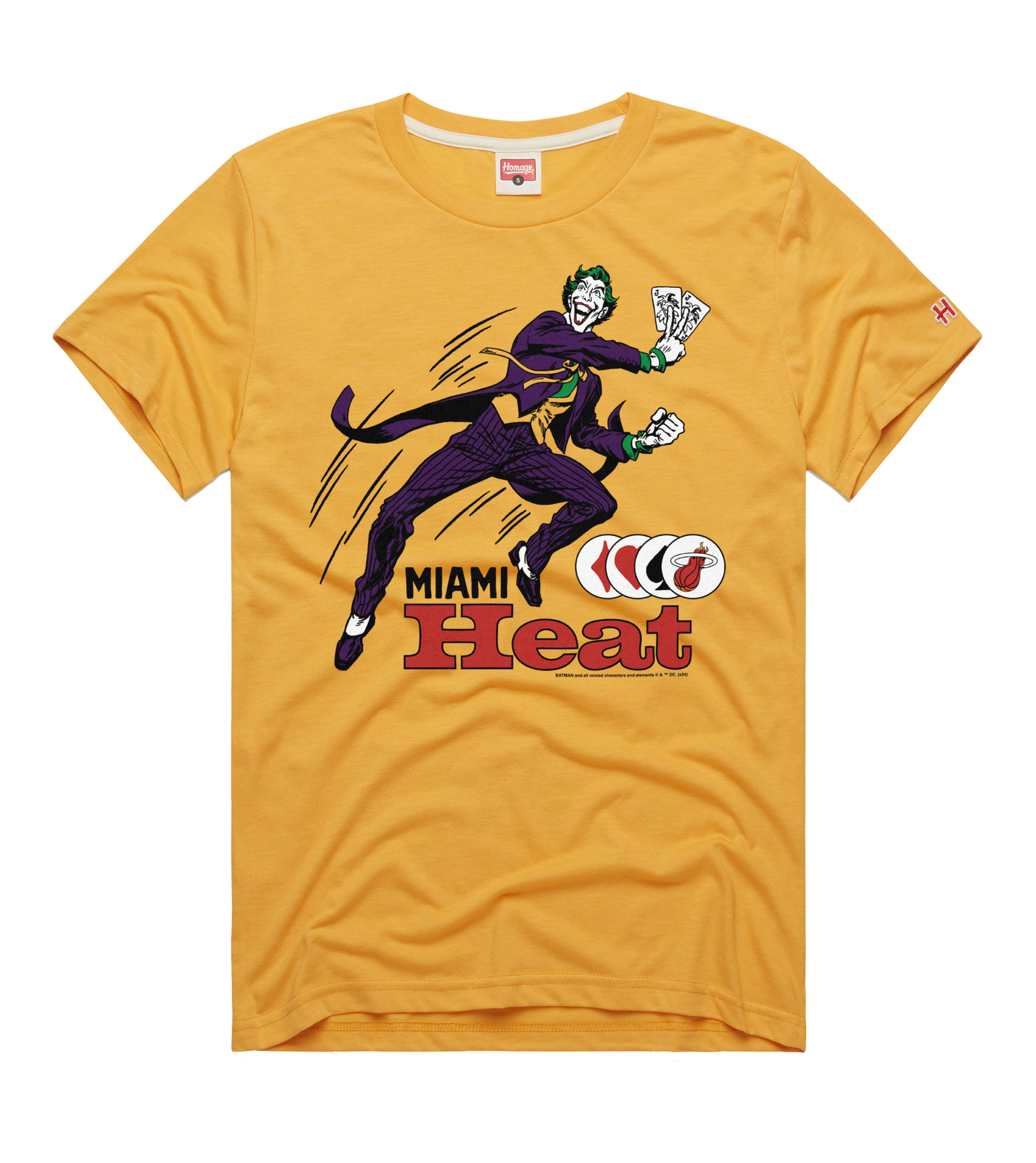 Yellow Homage Miami HEAT short-sleeve tee with Joker graphic and bold team logo. - Homage Miami HEAT Joker Tee