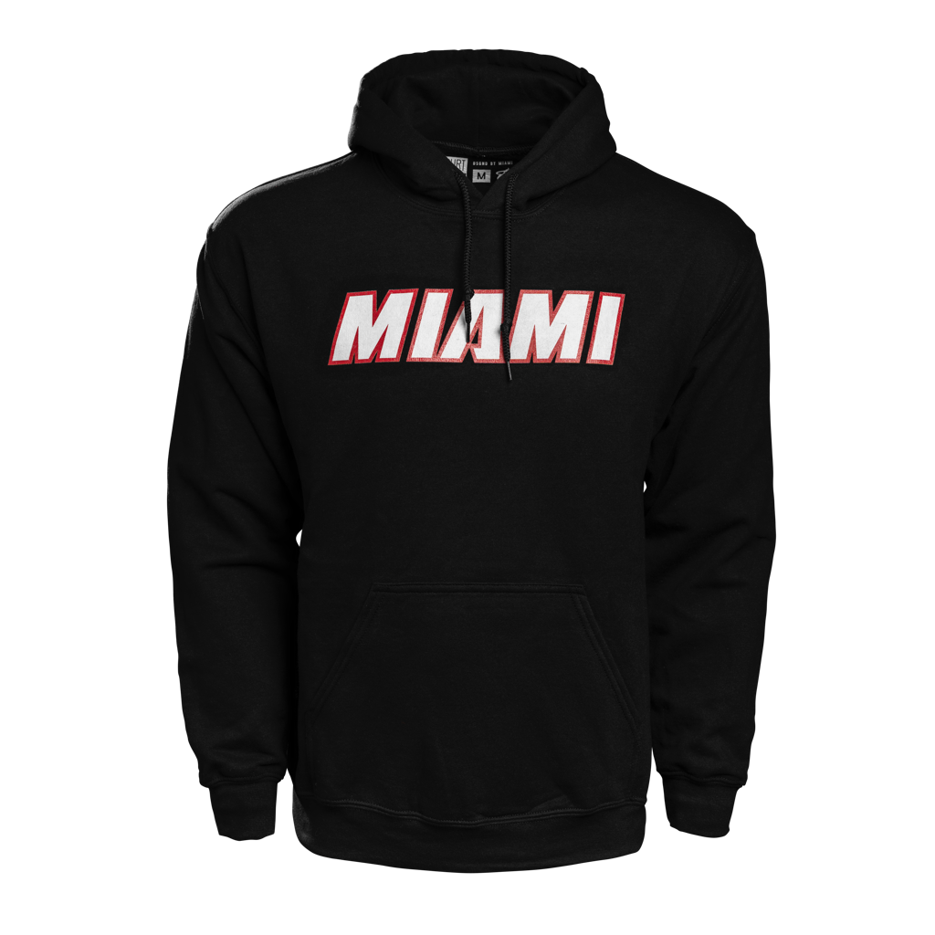 Black unisex pullover hoodie with red and white Miami HEAT text and front kangaroo pocket. - Court Culture Miami Unisex Pullover Hoodie