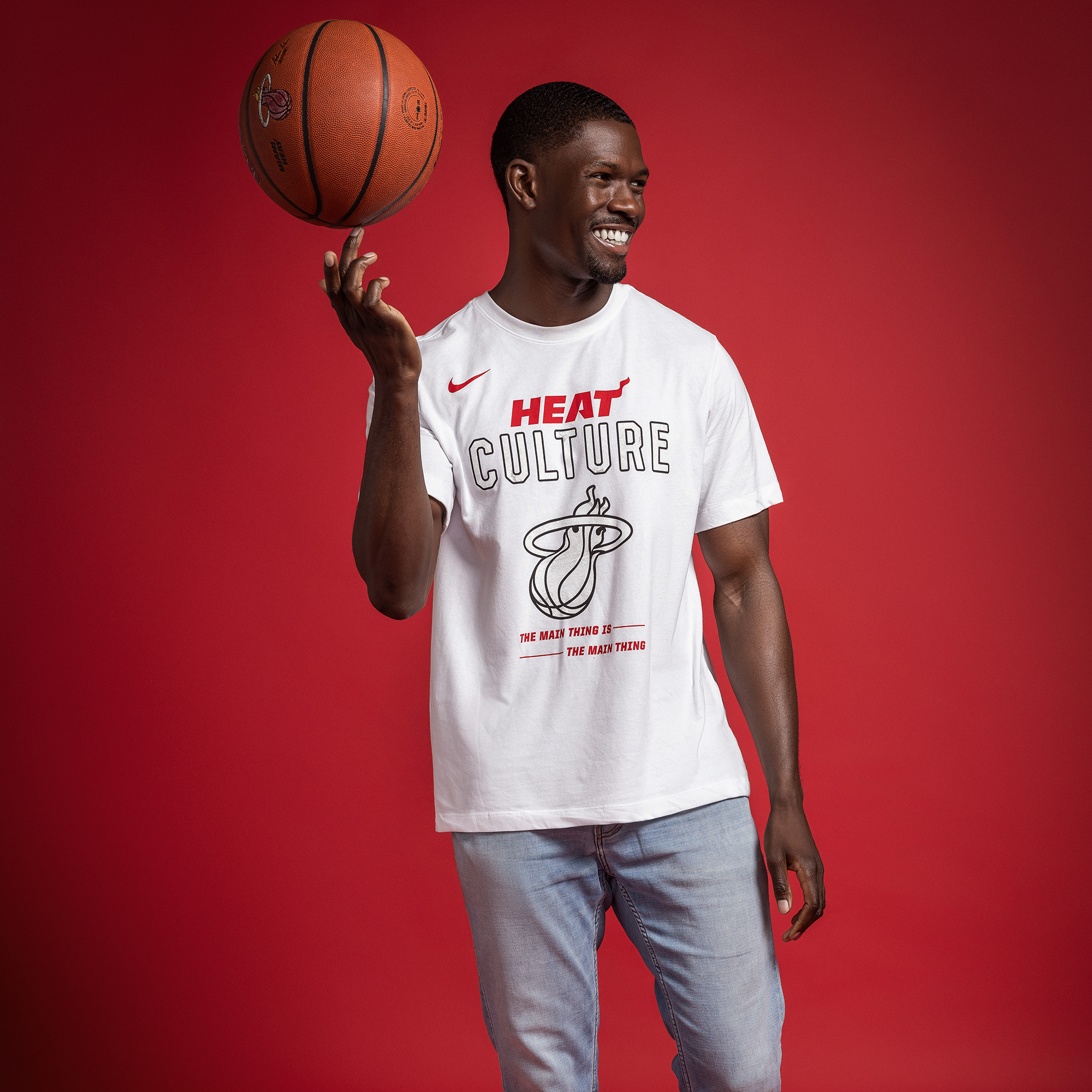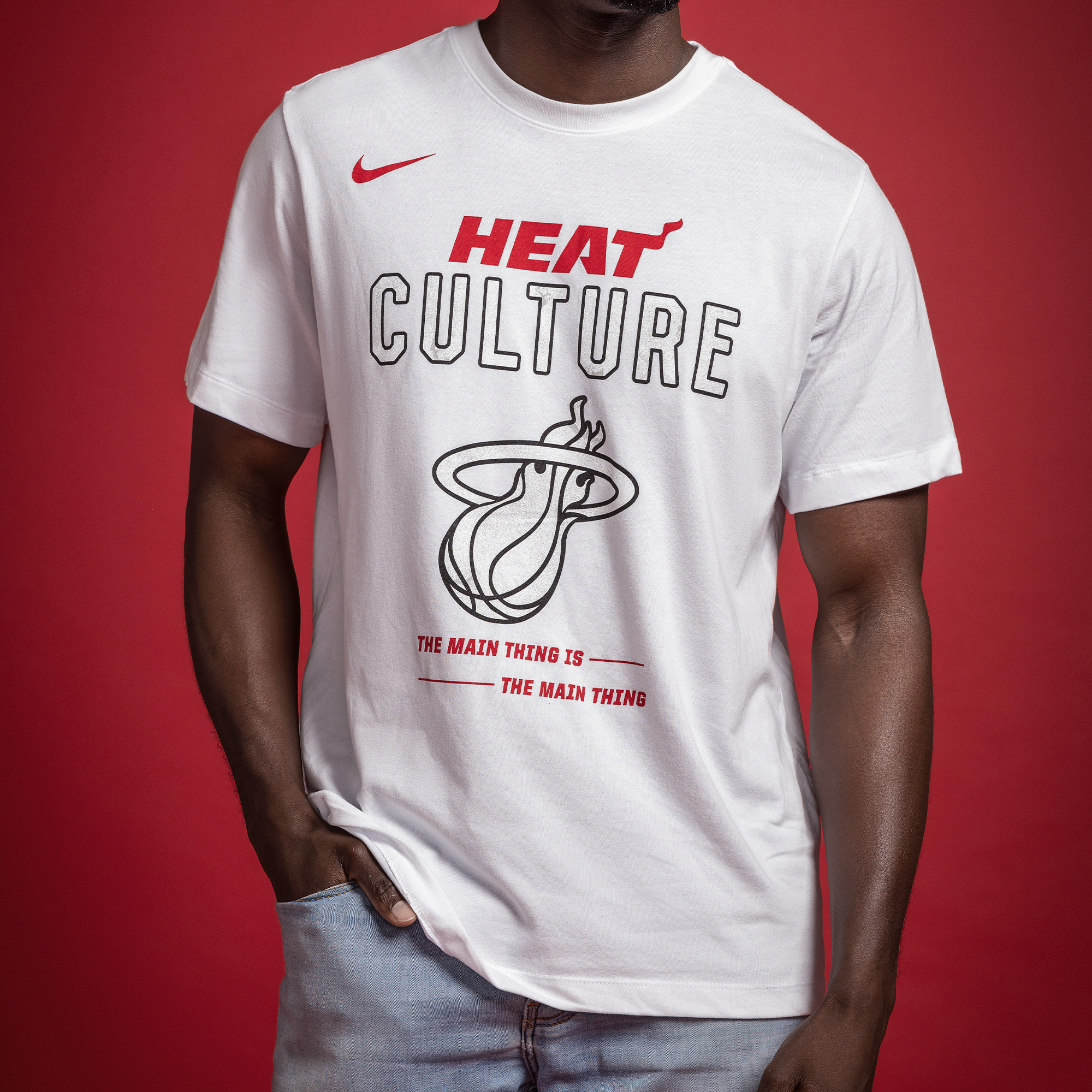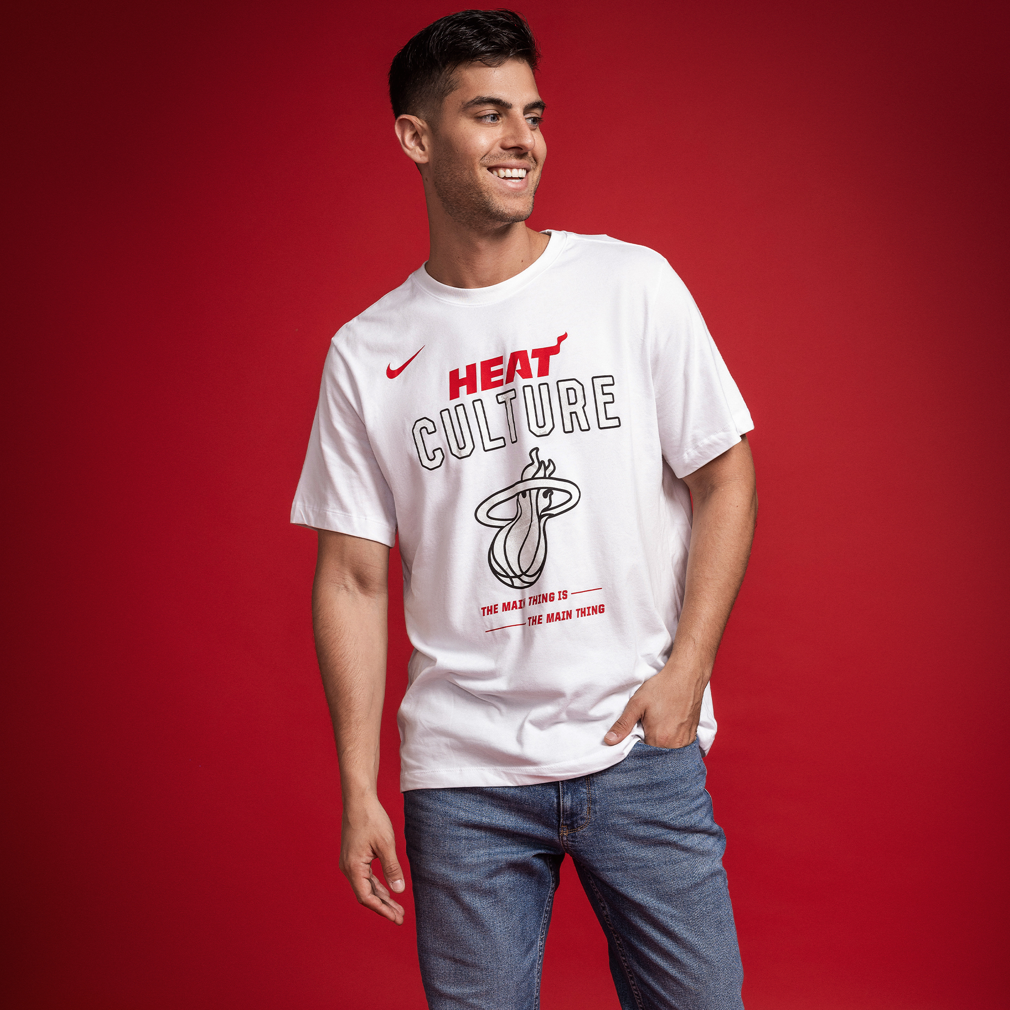 White Nike Miami HEAT Culture Legend tee with red and black graphic logo on front. - Nike HEAT Culture Legend White Tee