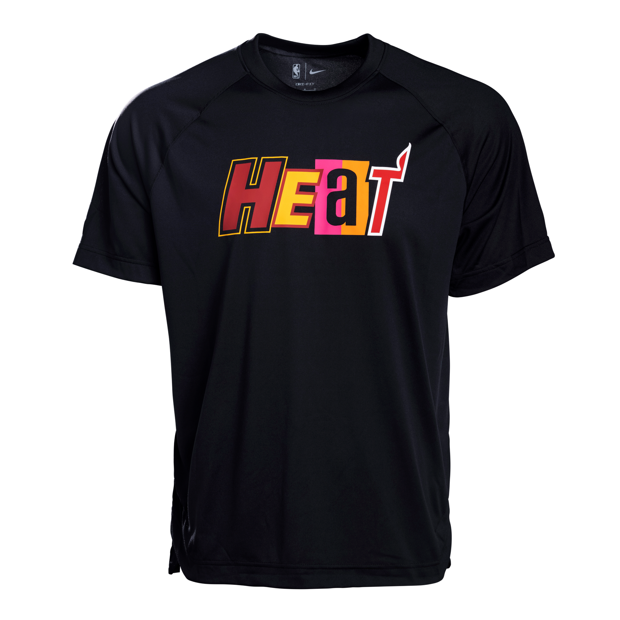 Black Nike Miami HEAT pre-game tee with bold yellow, red, and white mashup logo on front. - Nike Miami HEAT Mashup Pre-Game Tee