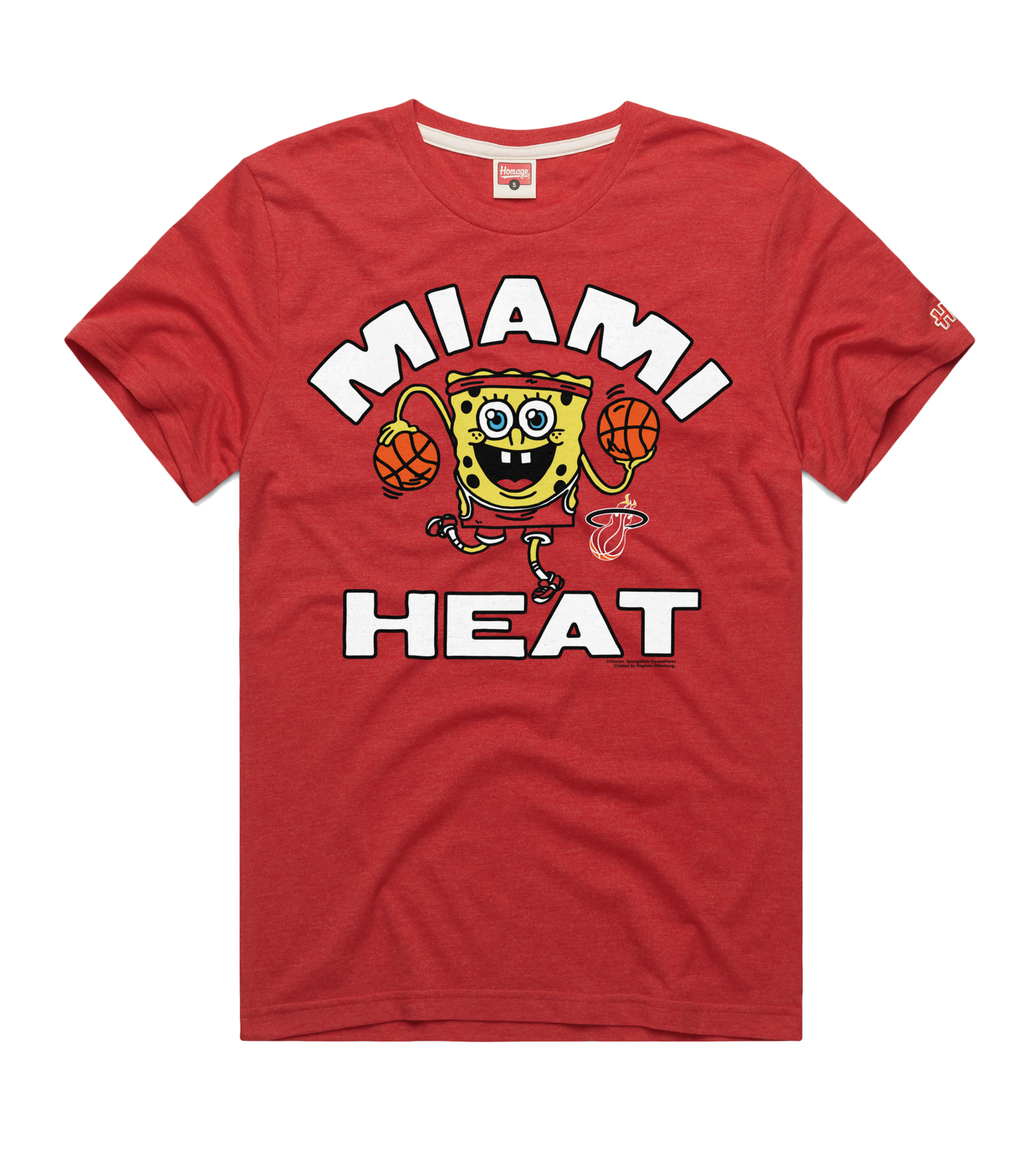 Red short-sleeve tee featuring SpongeBob wearing Miami HEAT gear with white