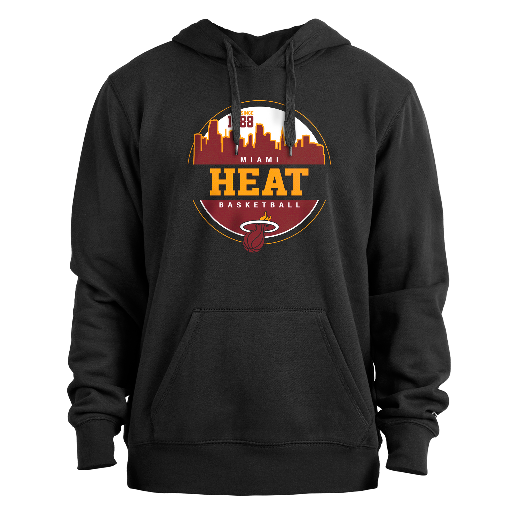 Black Miami HEAT hoodie with front kangaroo pocket and graphic logo featuring city skyline and basketball. - New Era Miami HEAT Tipoff Hoodie