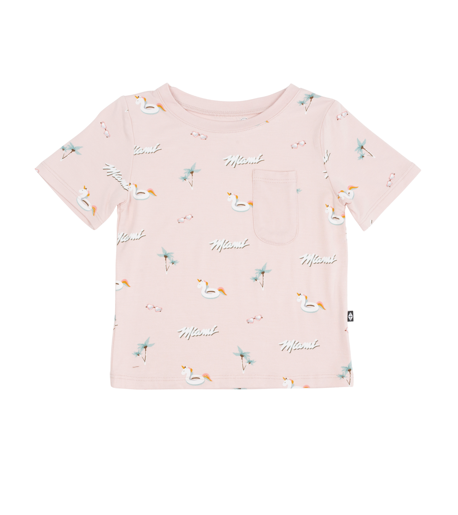 Blush pink toddler crew neck tee with Miami HEAT logo, palm tree, and pelican print, front pocket. - Court Culture x Kyte Baby Beach Blush Toddler Crew Neck Tee