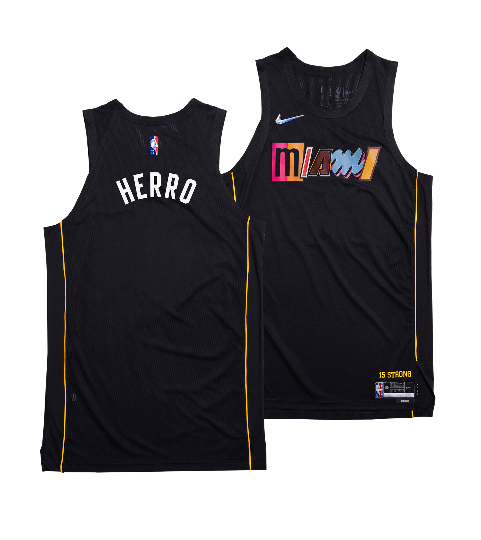 The uniform also weaves in several references to the HEAT’s Championship-winning history. On the jersey’s “anthem” spot (located just above the jock tag) appears the “15 STRONG” wordmark: a rallying cry throughout the team’s 2006 Championship run. Just below that is a list of the three years in which the HEAT have won a Championship, each stacked vertically on the shorts’ waistband. Rounding out the uniform is a thin golden stripe that frames the ensemble of elements—a nod to the infamous yellow ropes brought out seconds before “The Shot” during the 2013 Finals.