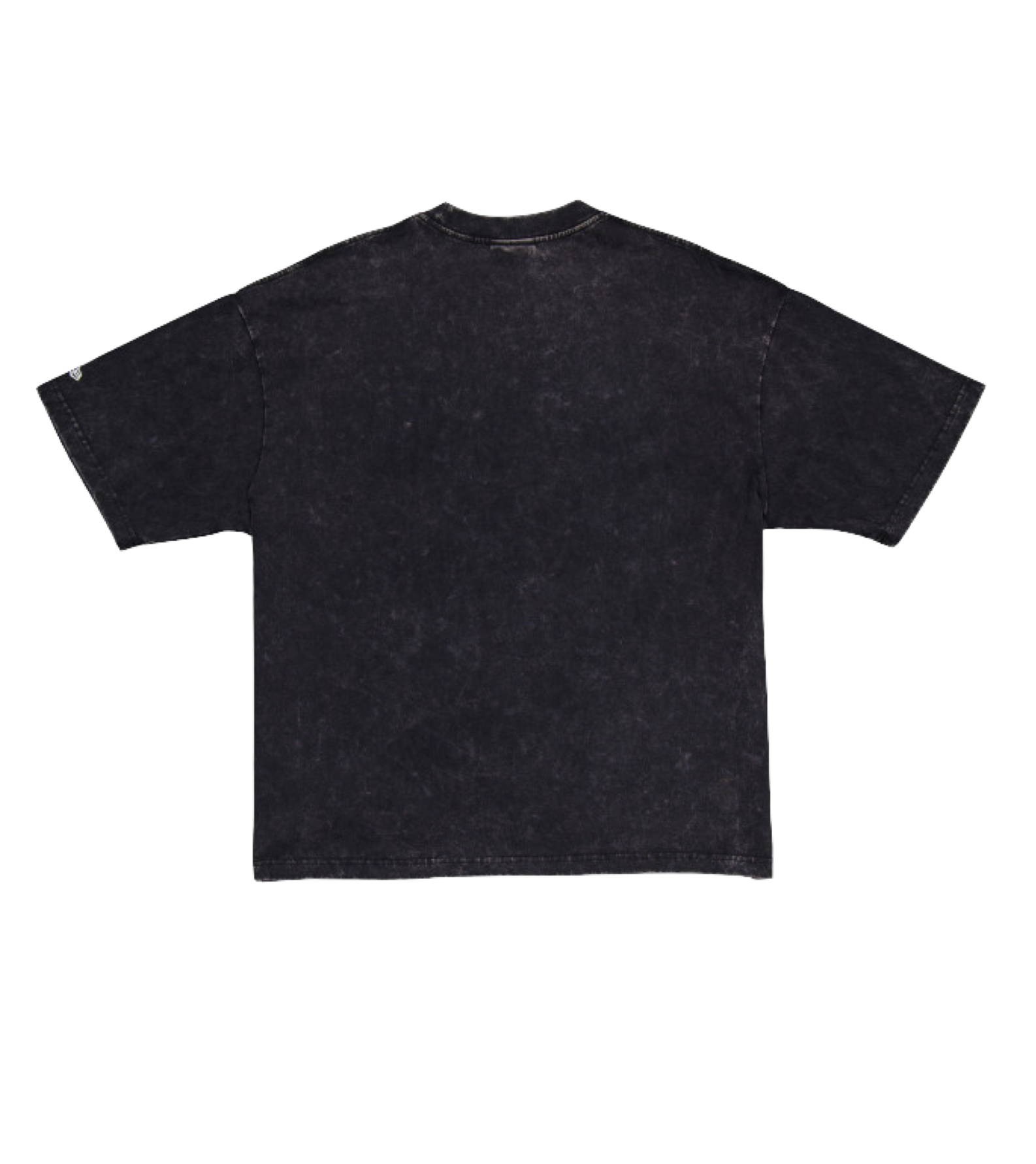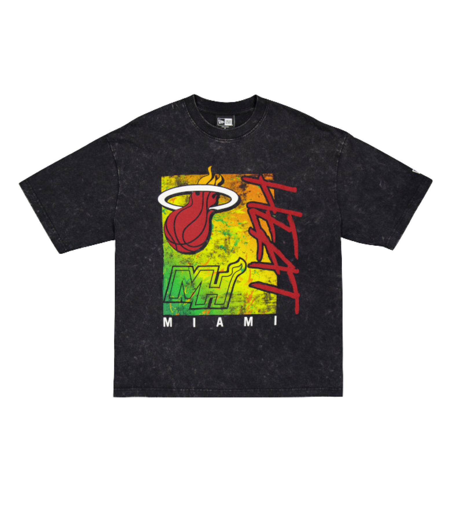 Black distressed New Era Miami HEAT tee with retro logo and graffiti-style text. - New Era Miami HEAT Distressed Tee