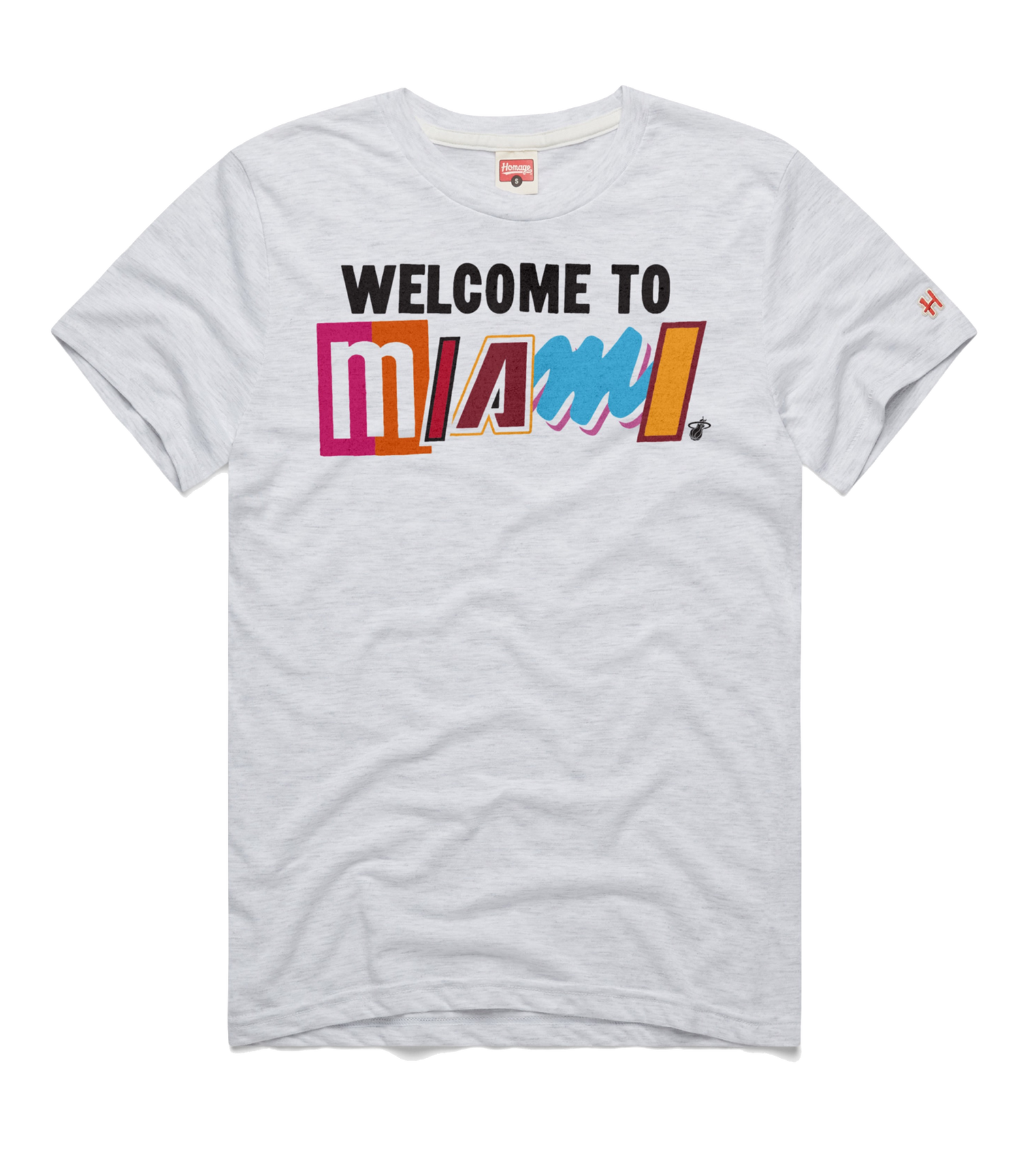 White Homage Mashup Vol. 2 tee with colorful Welcome to Miami text and subtle Miami HEAT logo on sleeve. - Homage Miami Mashup Vol. 2 Welcome To Miami Tee