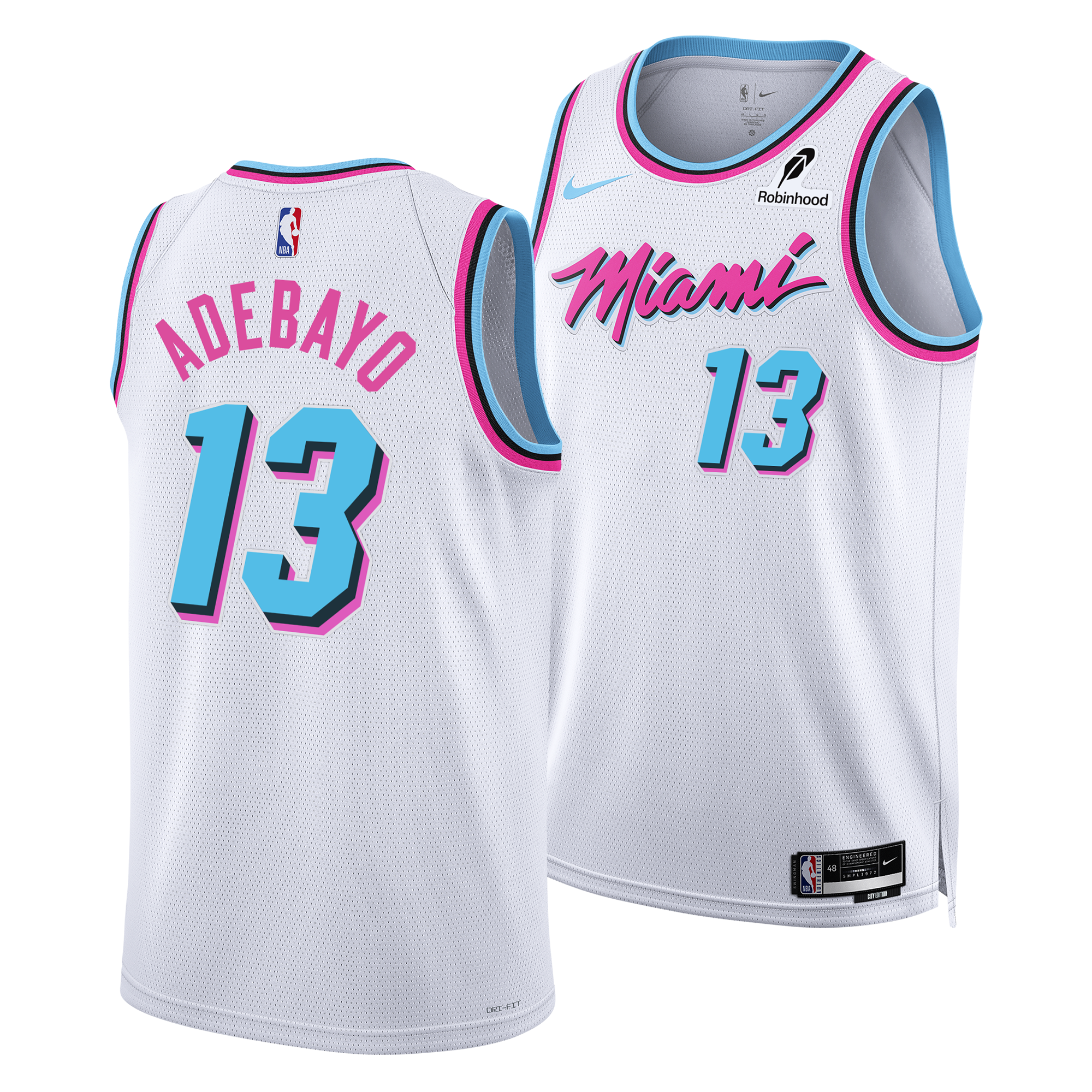 White Bam Adebayo Miami Heat youth swingman jersey with pink and blue accents and number 13.